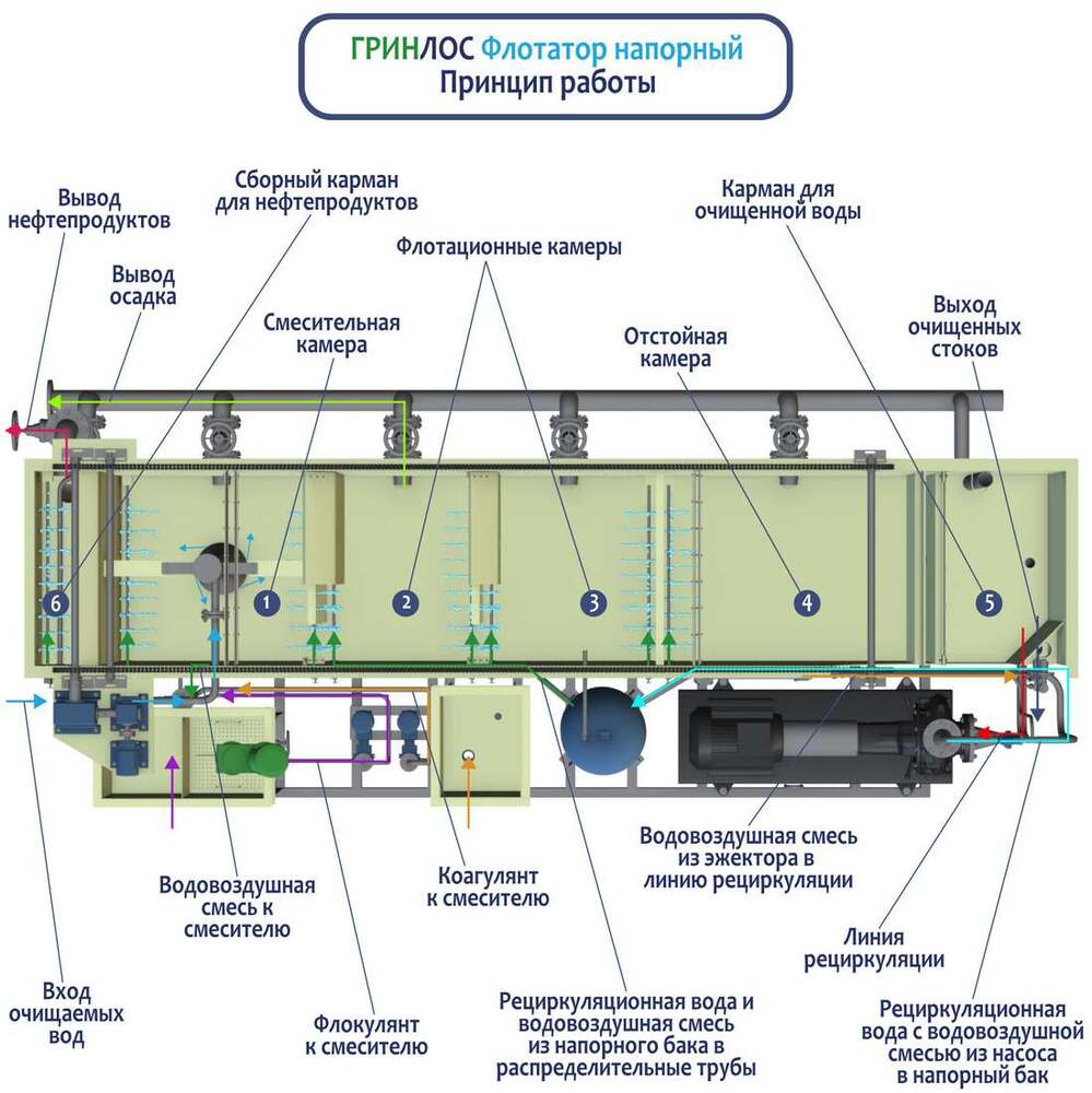 ГРИНЛОС Флотатор напорный предназначен для физико-химической очистки сточных вод от взвешенных веществ, жиров, масел, нефтепродуктов и поверхностно-активных веществ. В основе принципа работы – насыщение стоков воздухом под давлением и последующее выделение микропузырьков при снижении давления, что обеспечивает всплытие загрязнений и образование слоя флотошлама.