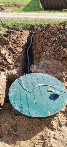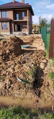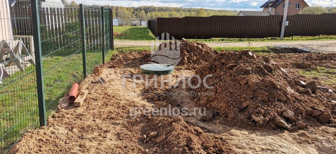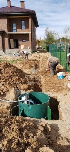 Помощь по подбору оборудования. Оперативная доставка оборудования на объект. Земляные работы: подготовка котлована и траншей, уплотнение дна котлована гравийно-песчаной смесью. Установка септика ГРИНЛОС Аэро 5 Пр Миди в котлован, его обсыпка грунтом. Прокладка и подключение труб.