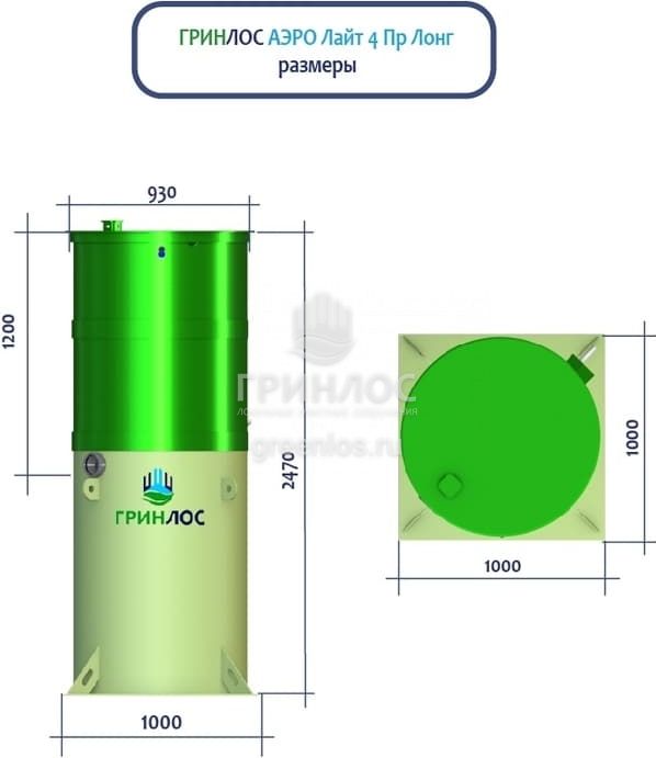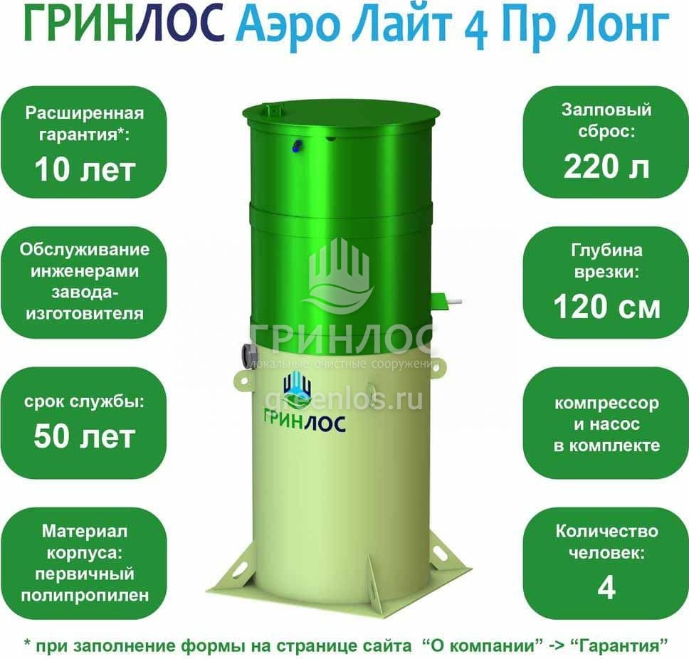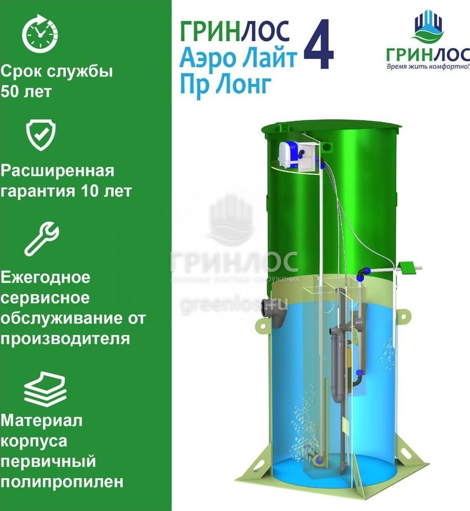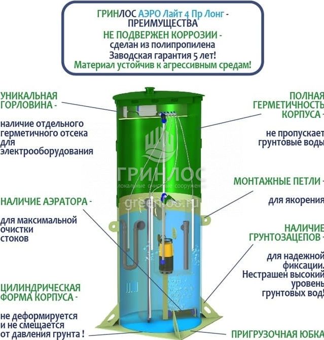 Отличительными особенностями септика Гринлос Аэро Лайт 4 Пр Лонг являются: