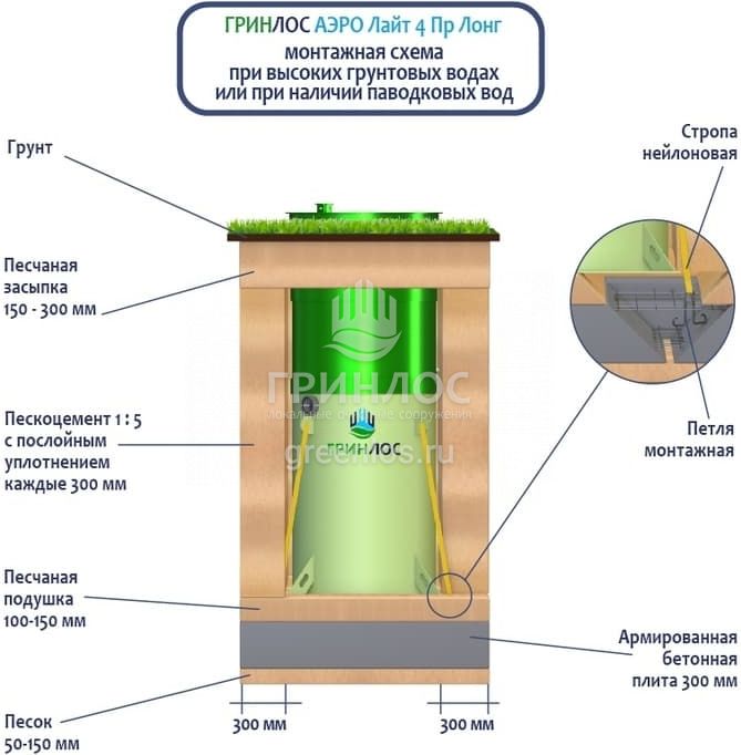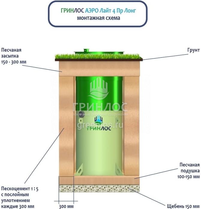 Перед непосредственным монтажом Гринлос Аэро Лайт 4 Пр Лонг специалисты осуществляют подготовку котлована. Его размеры определяются конструктивными особенностями выбранной модели оборудования. Ознакомиться с данными параметрами можно в приложении к ПС.