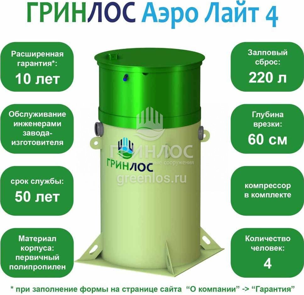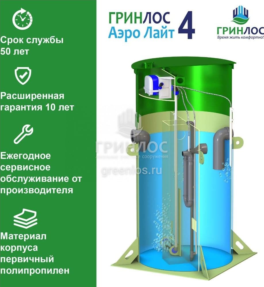 Отличительными особенностями септика Гринлос Аэро Лайт 4 являются: