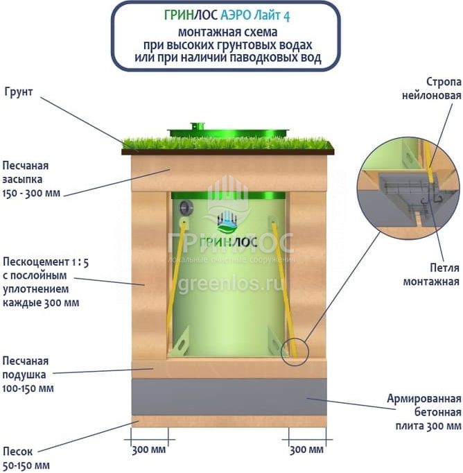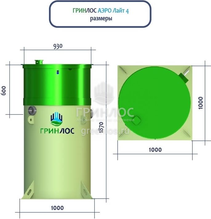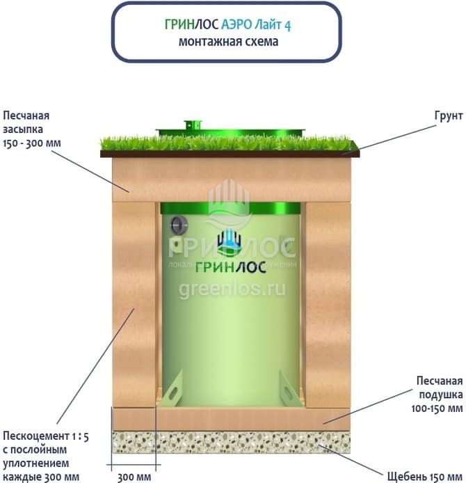 Высота корпуса Гринлос Аэро Лайт 4 — 1.87 м, а врезка подводящей трубы осуществляется на глубине до 60 см. Станция подходит для монтажа во все виды почв: песок, глина, суглинок, грунты с высоким уровнем грунтовых вод.