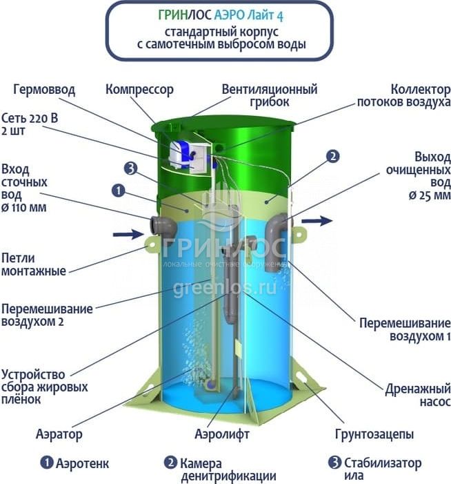 Септики ГРИНЛОС ГРИНЛОС Аэро Лайт оснащены аэратором, нагнетающим воздух для размножения аэробных бактерий. Вместе с анаэробными бактериями в биозагрузке это позволяет добиться максимальной переработки стоков.