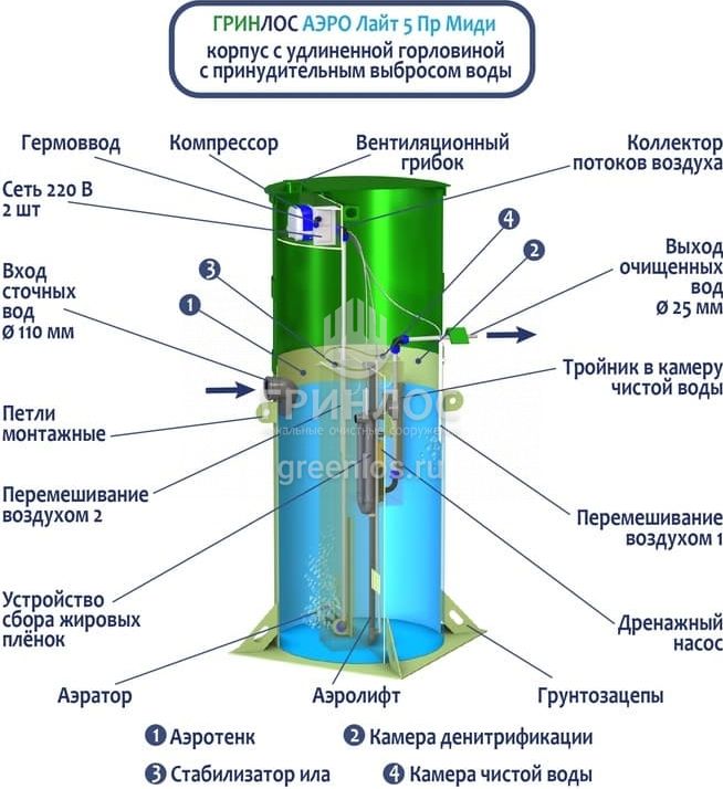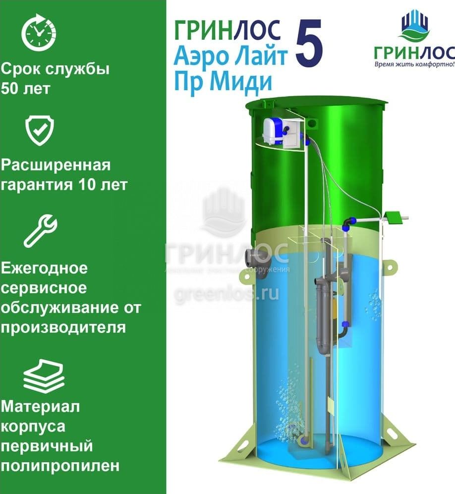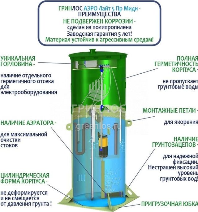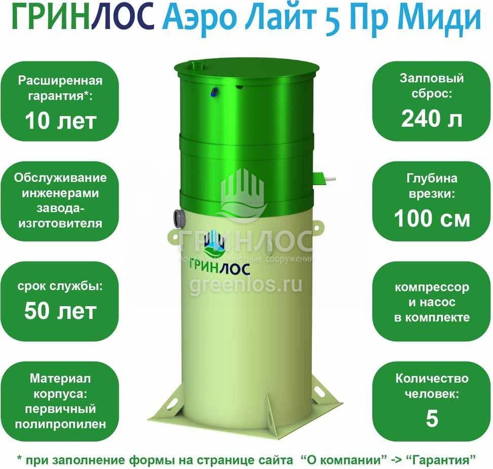 Отличительными особенностями септика Гринлос Аэро Лайт 5 Пр Миди являются: