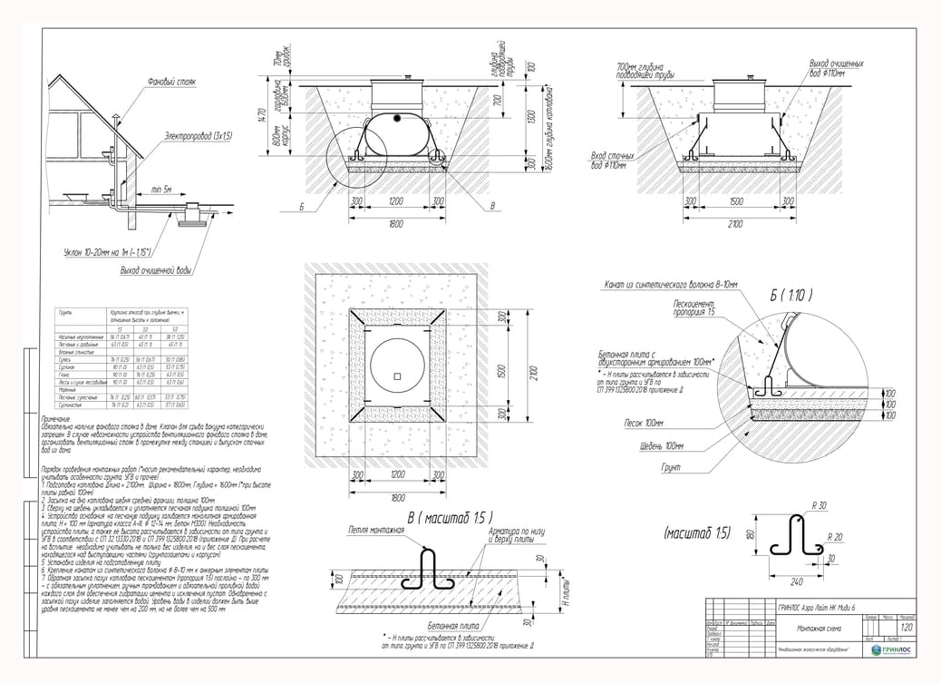 Рекомендуется поручить выбор и установку септика Гринлос Аэро Лайт НК специализированной компании. Перед началом монтажа специалисты должны подготовить котлован, размеры которого определяются конструктивными особенностями выбранной модели. Эти параметры можно найти в приложении к проектной документации. Важно оставить свободное пространство не менее 250 мм между боковыми стенками корпуса и грунтом.