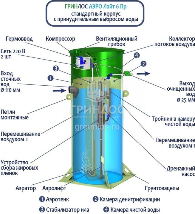Станция Гринлос Аэро Лайт 6 Пр сконструирована таким образом, что все камеры, в которых происходит аэрация, разделение и осветление стоков объединены в одном корпусе цилиндрической формы.