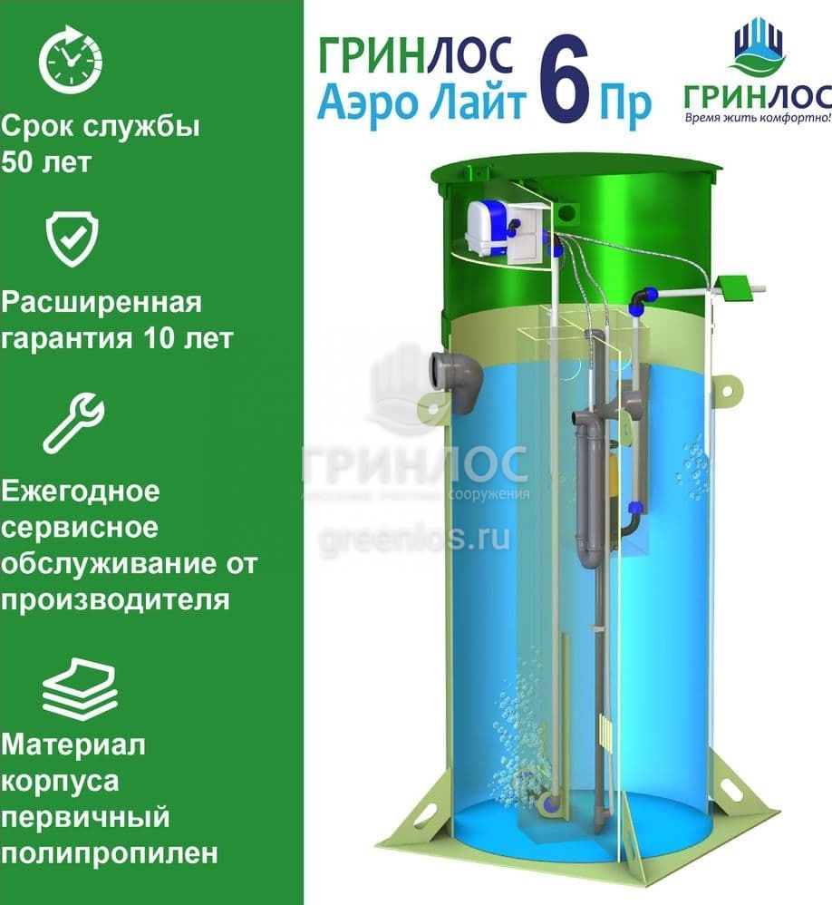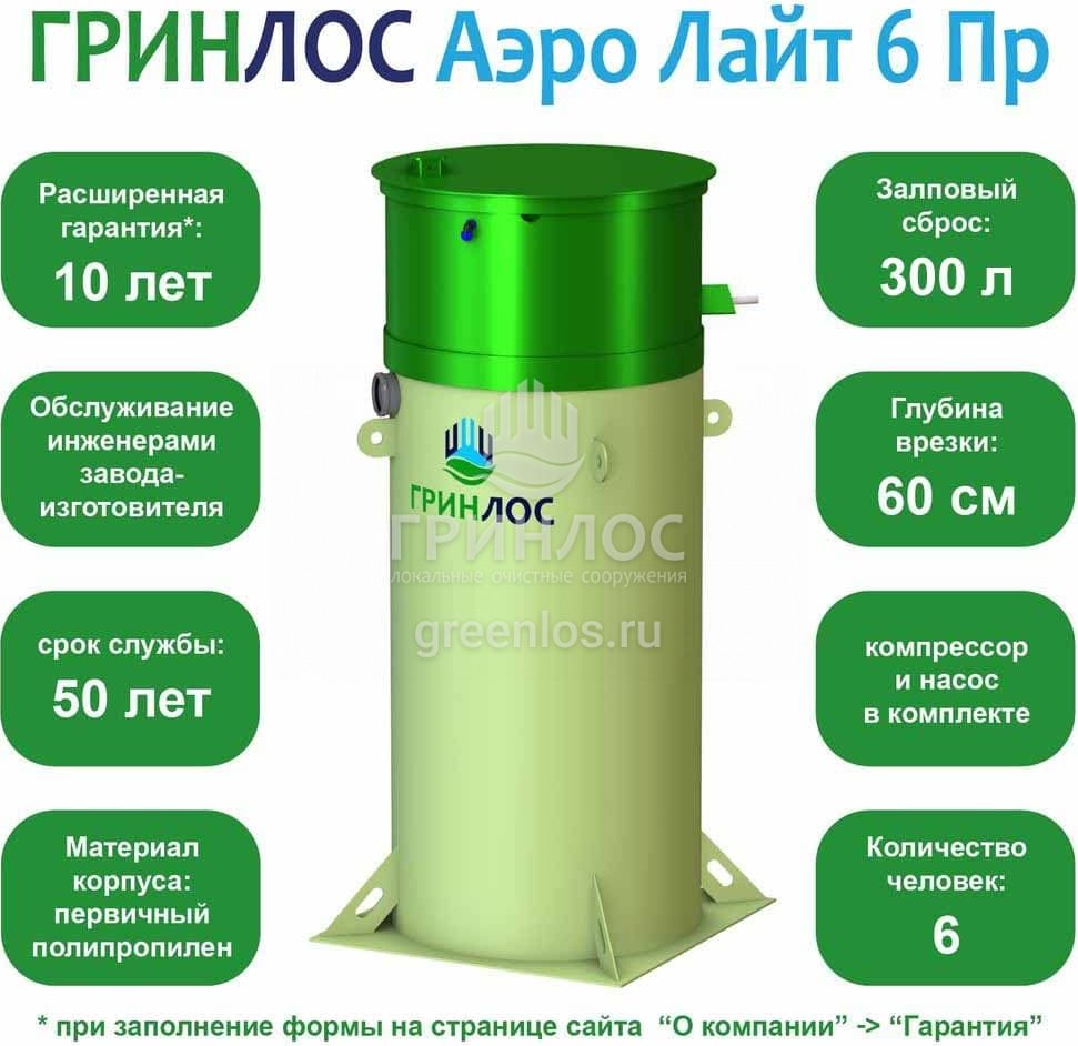 Отличительными особенностями септика Гринлос Аэро Лайт 6 Пр являются: