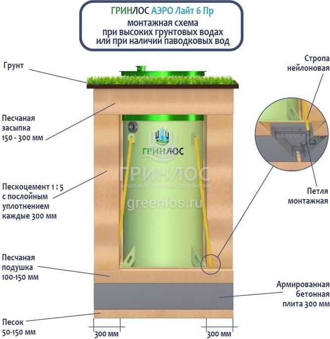 Станции очистки Гринлос Аэро Лайт 6 Пр обладают надежными грунтозацепами, действительно предотвращающими всплытие оборудования на обводненных участках.