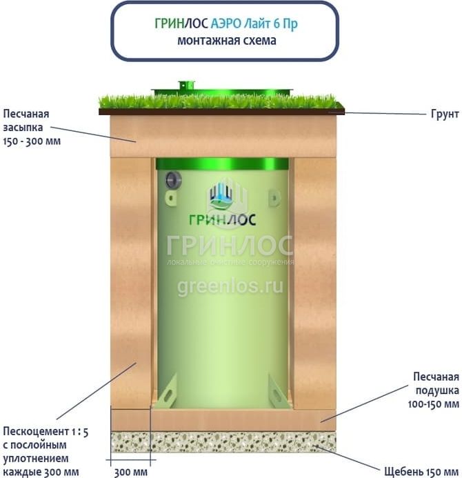 Высота корпуса Гринлос Аэро Лайт 6 Пр — 2.27 м, а врезка подводящей трубы осуществляется на глубине до 60 см. Станция подходит для монтажа во все виды почв: песок, глина, суглинок, грунты с высоким уровнем грунтовых вод.