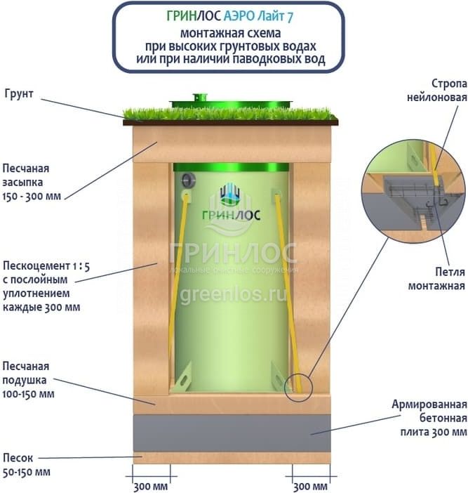 Высота корпуса Гринлос Аэро Лайт 7 — 2.37 м, а врезка подводящей трубы осуществляется на глубине до 60 см. Станция подходит для монтажа во все виды почв: песок, глина, суглинок, грунты с высоким уровнем грунтовых вод.