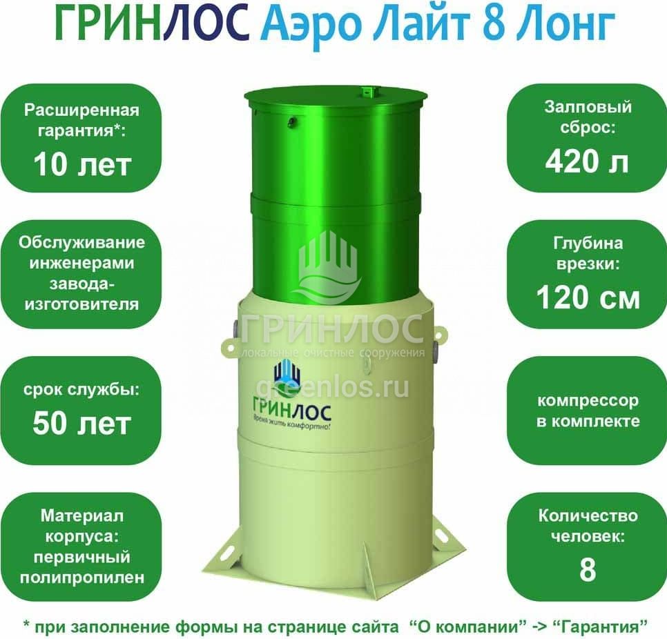 Отличительными особенностями септика Гринлос Аэро Лайт 8 Лонг являются: