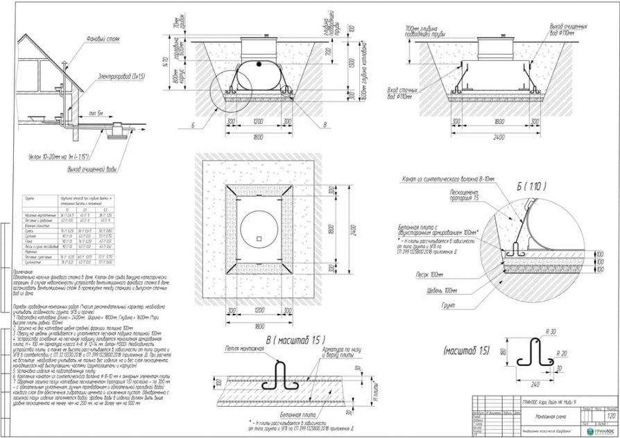 Дно котлована требует более тщательной подготовки: его необходимо выровнять и засыпать слоем песка толщиной 30 см. Кроме того, углубления котлована необходимо засыпать песком, увлажнять послойно. Перед проведением этих работ станцию заполняют водой на одну четверть её объема, а затем уровень воды увеличивается пропорционально засыпке песком внешних стенок. Каждый слой песка толщиной в 200 мм должен дополнительно уплотняться вручную.