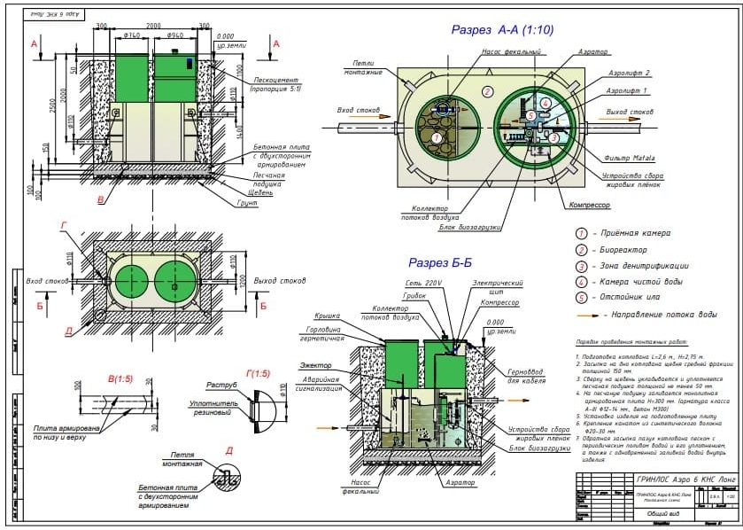 Перед непосредственным монтажом Гринлос Аэро с КНС 6 Пр Лонг специалисты осуществляют подготовку котлована. Его размеры определяются конструктивными особенностями выбранной модели оборудования. Ознакомиться с данными параметрами можно в приложении к ПС.