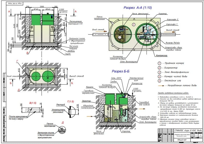 Перед непосредственным монтажом Гринлос Аэро с КНС 8 Пр Миди специалисты осуществляют подготовку котлована. Его размеры определяются конструктивными особенностями выбранной модели оборудования. Ознакомиться с данными параметрами можно в приложении к ПС.