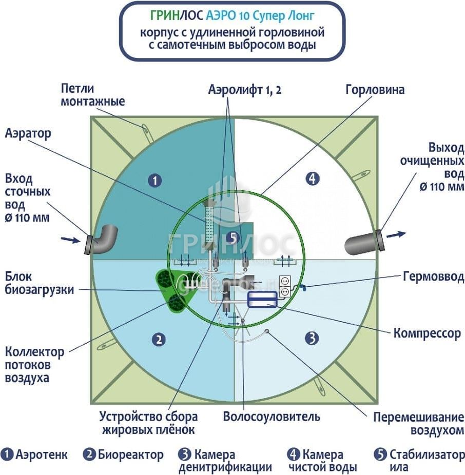 Станция ГРИНЛОС Аэро 10 Супер Лонг сконструирована таким образом, что все камеры, в которых происходит аэрация, разделение и осветление стоков объединены в одном корпусе цилиндрической или овальной формы.
