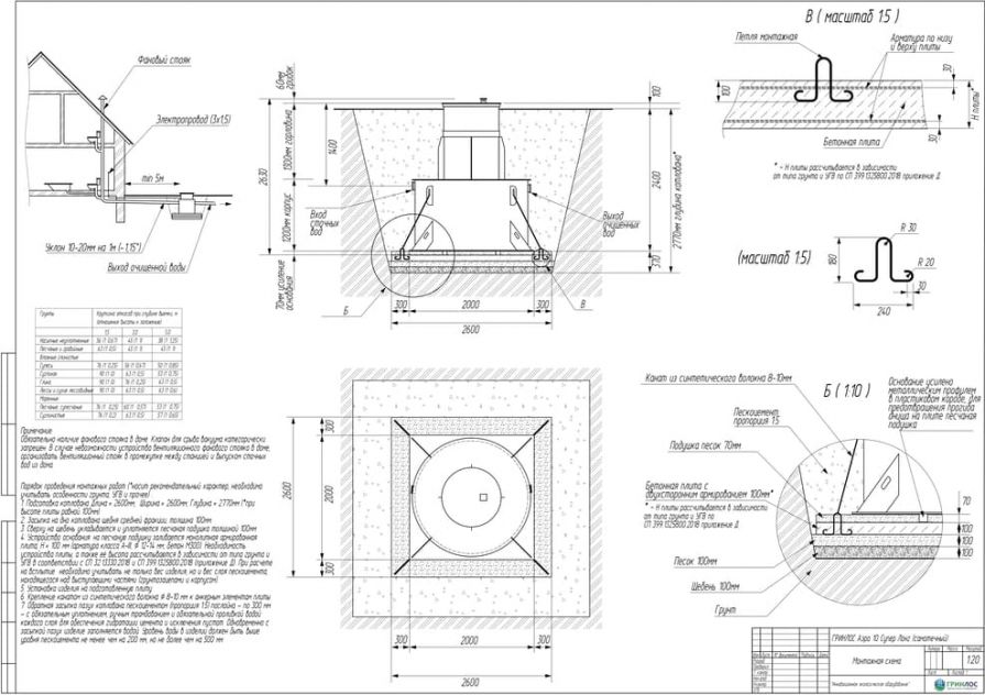 Целесообразно доверить выбор и монтаж оборудования специализированной компании. Перед непосредственным монтажом Оборудования специалисты осуществляют подготовку котлована. Его размеры определяются конструктивными особенностями выбранной модели оборудования. Ознакомиться с данными параметрами можно в приложении к ПС. По боковым стенкам корпуса должно быть сохранено свободное расстояние до грунта не менее 250 мм. Дно котлована нуждается в более тщательной подготовке. Его подвергают выравниванию с последующей засыпкой слоем песка, обладающим толщиной в пределах 10-15 см. Пазухи котлована подвергают обратной засыпке при помощи песка, который послойно поливают водой. Прежде чем приступить к аналогичным работам, емкость оборудования на четверть заполняют водой. Впоследствии количество воды внутри емкости увеличивают соразмерно уровню засыпки песком наружных стенок. Каждые 200 мм песка подвергаются ручному уплотнению.
