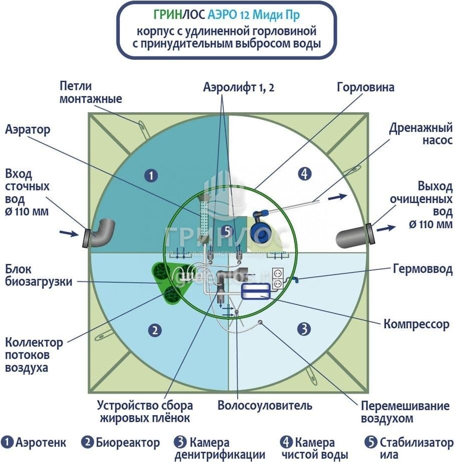 Конструкция септика ГРИНЛОС Аэро 12 Пр Миди представляет из себя цилиндр с горловиной, выполненный из монолитного полипропилена. Внутри цилиндра с помощью перегородок выделены четыре камеры, последовательно сообщающиеся между собой через отверстия и патрубки в перегородках, расположенные на определенной высоте.