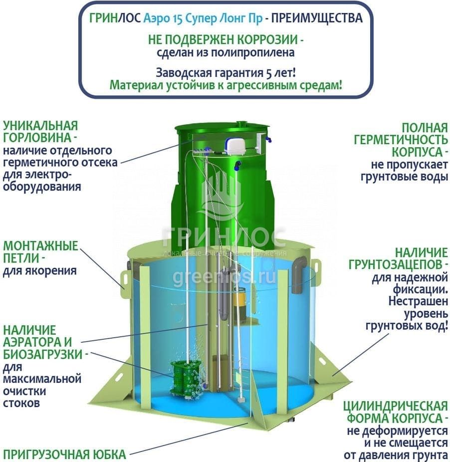 ГРИНЛОС Аэро 15 Пр Супер Лонг – это станция биологической очистки сточных вод аэрационного типа. Максимальный залповый сброс в септик равен 1100 л, а производительность станции равна 3 м3/сутки, что рассчитано на обслуживание 15 условных пользователей.
