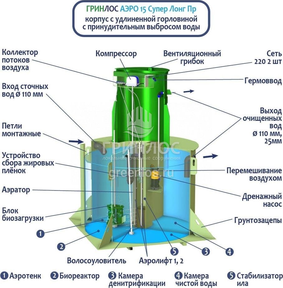 Естественный природный процесс в ГРИНЛОС Аэро 15 Пр Супер Лонг оптимизирован путем аэрации стоков и установки биофильтра (специального устройства, на котором образуется биопленка из микроорганизмов). Благодаря использованию двух видов ила – свободного и фиксированного, достигается более высокая степень очистки, удлиняется временной интервал планового обслуживания.