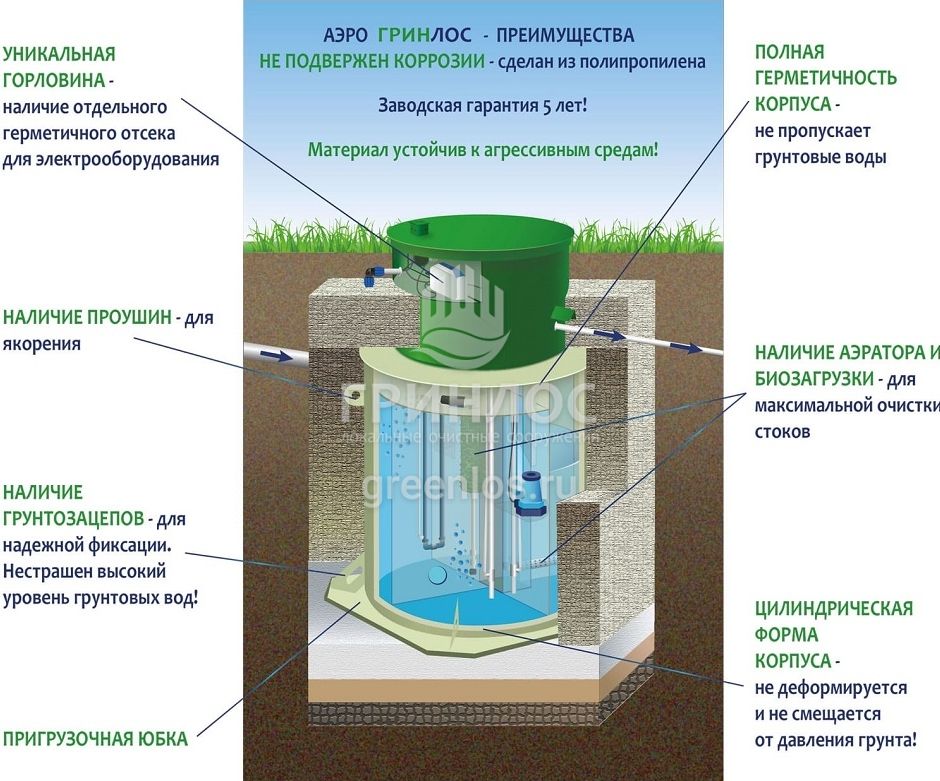 Септики ГРИНЛОС ГРИНЛОС Аэро оснащены аэратором, нагнетающим воздух для размножения аэробных бактерий. Вместе с анаэробными бактериями в биозагрузке это позволяет добиться максимальной переработки стоков .