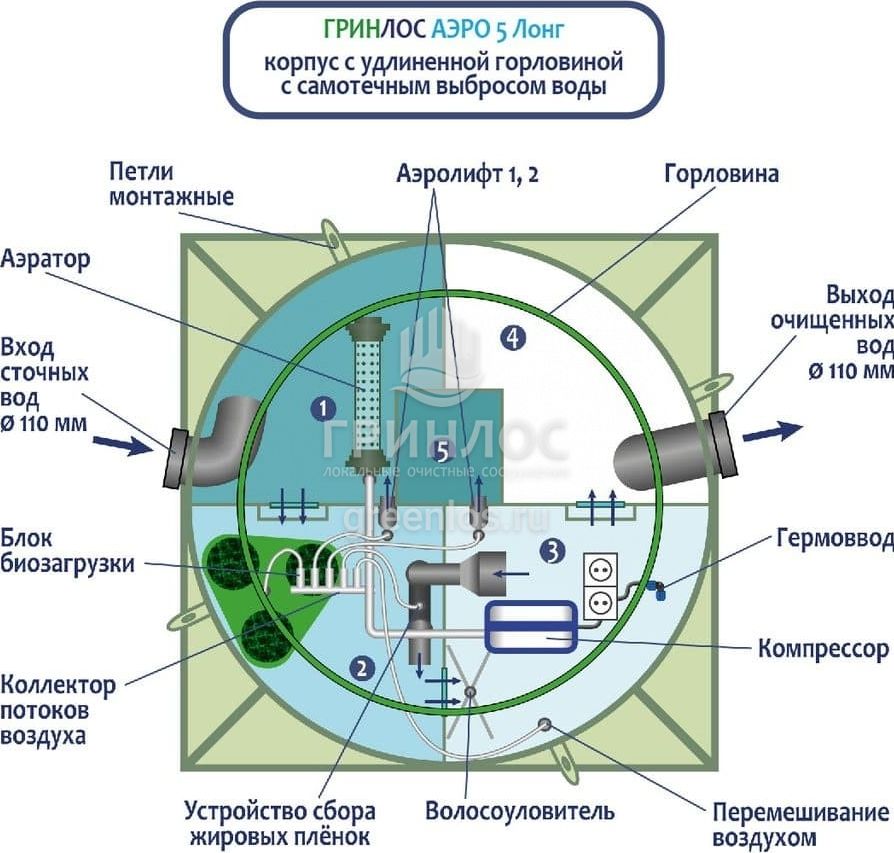 Септики ГРИНЛОС ГРИНЛОС Аэро оснащены аэратором, нагнетающим воздух для размножения аэробных бактерий. Вместе с анаэробными бактериями в биозагрузке это позволяет добиться максимальной переработки стоков .