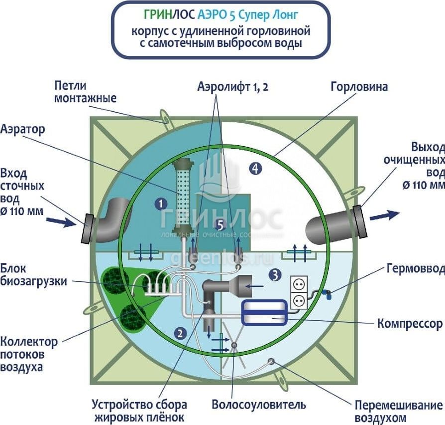 Станция ГРИНЛОС Аэро 5 Супер Лонг сконструирована таким образом, что все камеры, в которых происходит аэрация, разделение и осветление стоков объединены в одном корпусе цилиндрической или овальной формы.