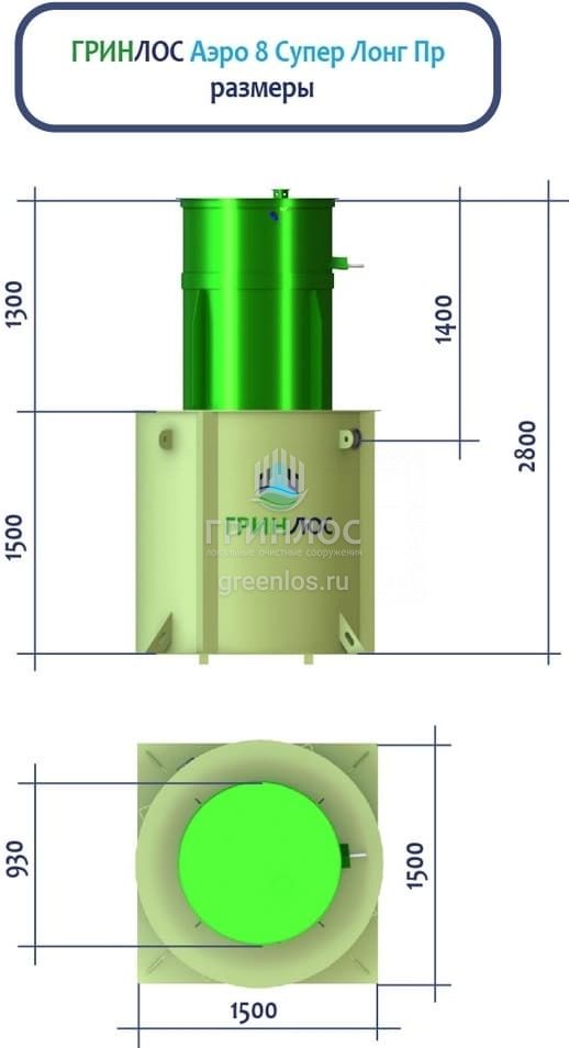 ГРИНЛОС Аэро 8 Пр Супер Лонг – это станция биологической очистки сточных вод аэрационного типа. Максимальный залповый сброс в септик равен 710 л, а производительность станции равна 1.4 м3/сутки, что рассчитано на обслуживание 8 условных пользователей.