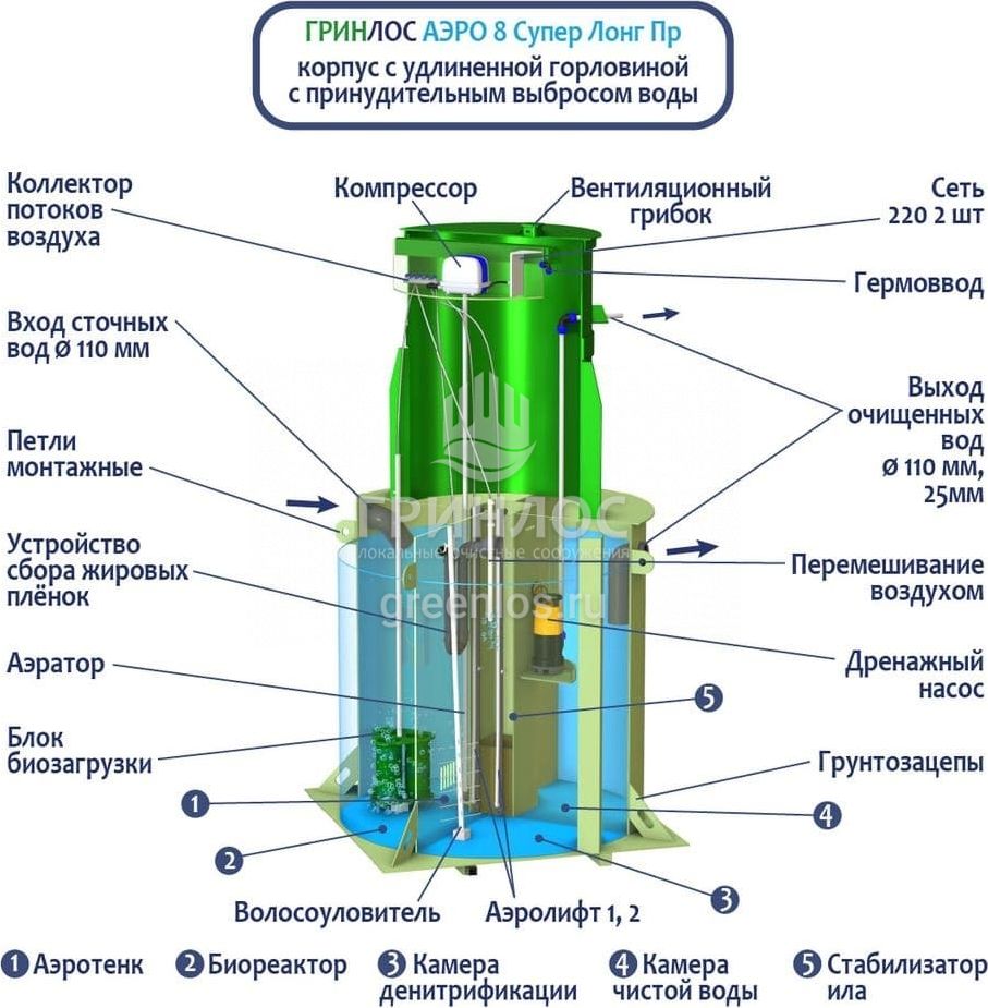 Станции биологической очистки ГРИНЛОС Аэро 8 Пр Супер Лонг предназначены для расщепления и переработки основных органических загрязнений, содержащихся в бытовых сточных водах. Эти процессы происходят в результате жизнедеятельности аэробных микроорганизмов, условия для жизнедеятельности которых создает ЛОС.