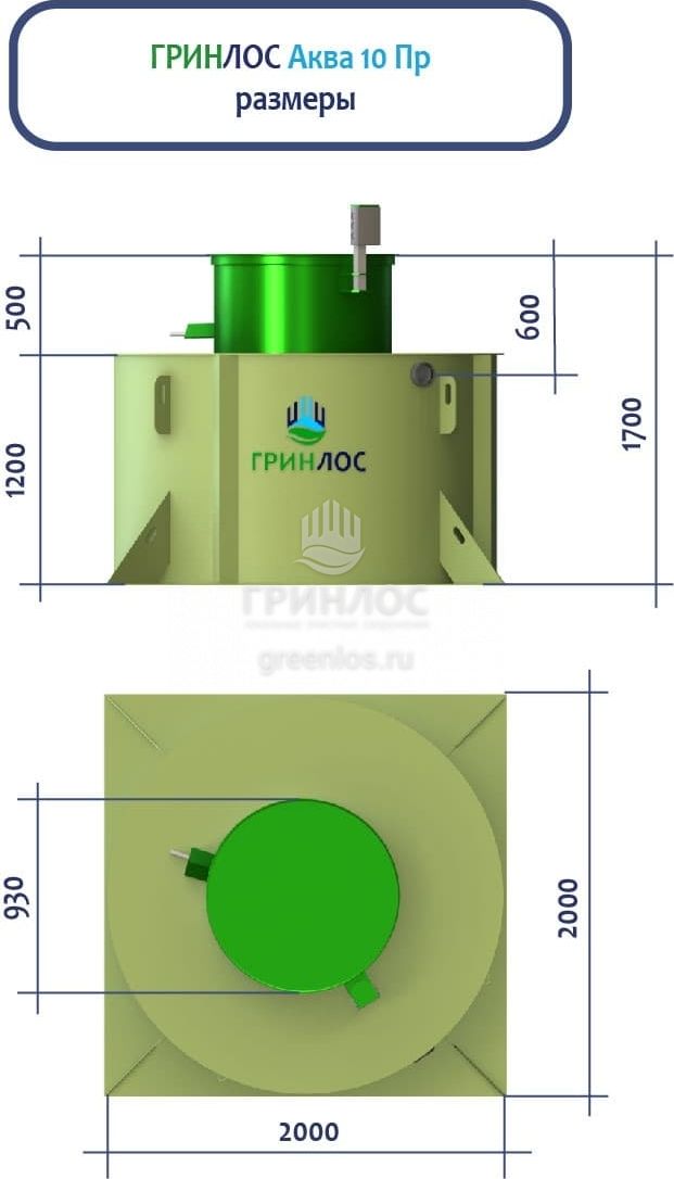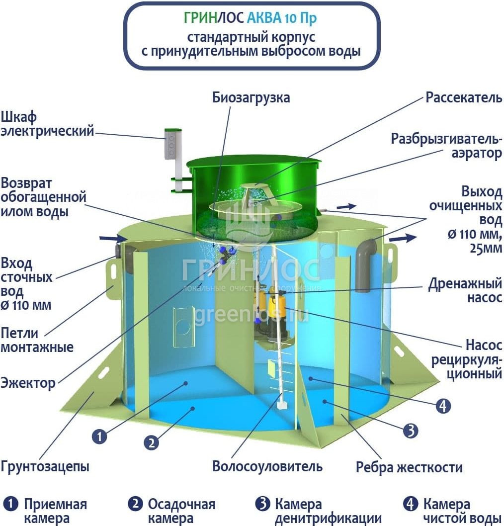 ГРИНЛОС Аква 10 Пр — это септик, который оснащен насосом. Обладает объемом залпового сброса 860 л и производительностью 2 м3/сутки, что делает его подходящим для домов, в которых число жильцов не превышает 10 условных пользователей. Оснащен фильтром грубой очистки и двумя насосами на полке.