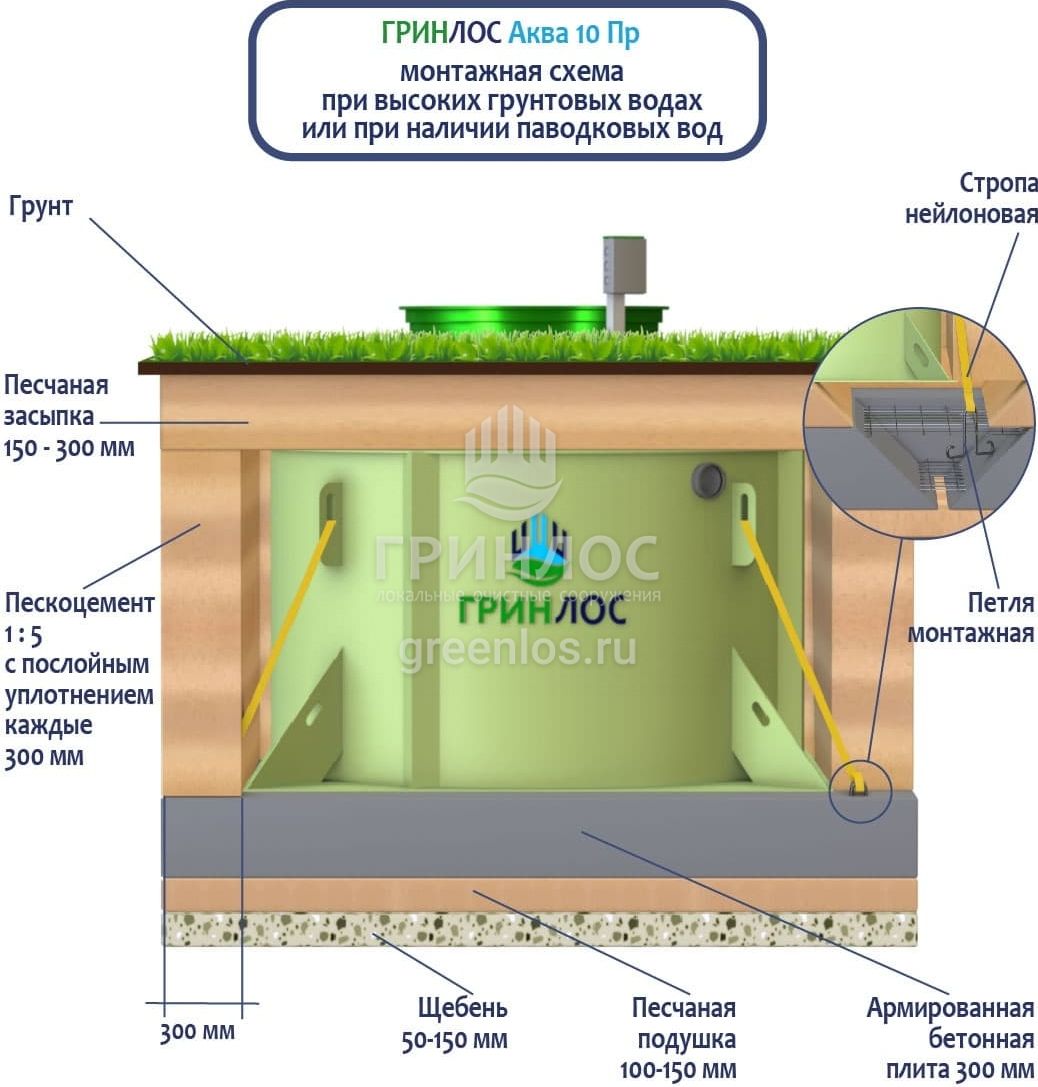Станции очистки ГРИНЛОС обладают надежными грунтозацепами, действительно предотвращающими всплытие оборудования на обводненных участках.