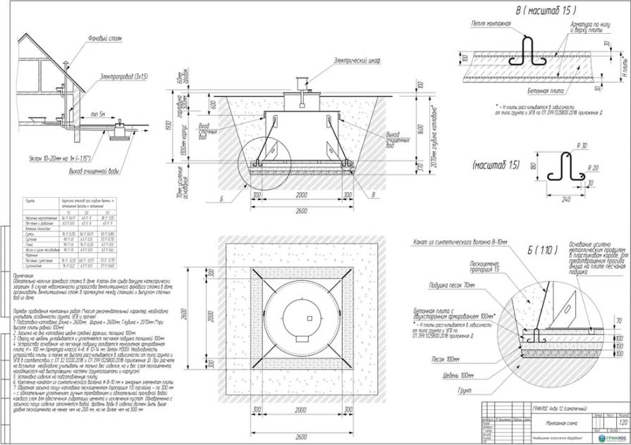 Целесообразно доверить выбор и монтаж оборудования специализированной компании. Перед непосредственным монтажом Оборудования специалисты осуществляют подготовку котлована. Его размеры определяются конструктивными особенностями выбранной модели оборудования. Ознакомиться с данными параметрами можно в приложении к ПС. По боковым стенкам корпуса должно быть сохранено свободное расстояние до грунта не менее 250 мм. Дно котлована нуждается в более тщательной подготовке. Его подвергают выравниванию с последующей засыпкой слоем песка, обладающим толщиной в пределах 10-15 см. Пазухи котлована подвергают обратной засыпке при помощи песка, который послойно поливают водой. Прежде чем приступить к аналогичным работам, емкость оборудования на четверть заполняют водой. Впоследствии количество воды внутри емкости увеличивают соразмерно уровню засыпки песком наружных стенок. Каждые 200 мм песка подвергаются ручному уплотнению.
