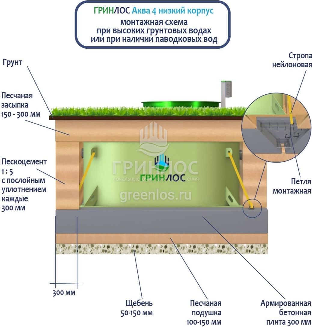 Станции очистки ГРИНЛОС обладают надежными грунтозацепами, действительно предотвращающими всплытие оборудования на обводненных участках.