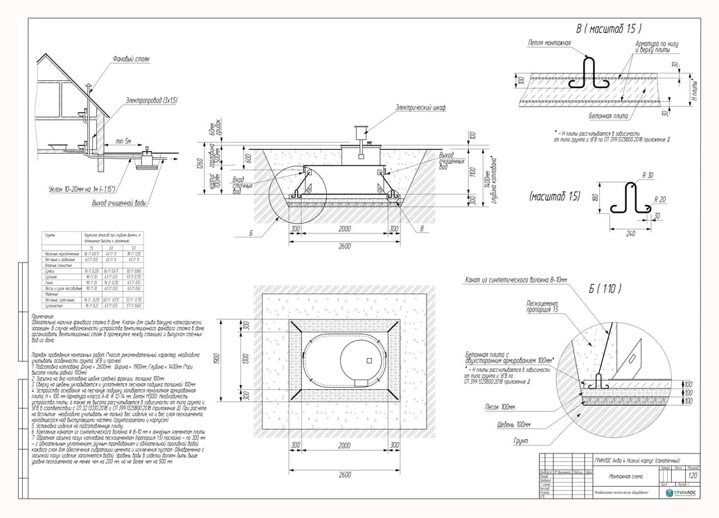 Целесообразно доверить выбор и монтаж оборудования специализированной компании. Перед непосредственным монтажом Оборудования специалисты осуществляют подготовку котлована. Его размеры определяются конструктивными особенностями выбранной модели оборудования. Ознакомиться с данными параметрами можно в приложении к ПС. По боковым стенкам корпуса должно быть сохранено свободное расстояние до грунта не менее 250 мм. Дно котлована нуждается в более тщательной подготовке. Его подвергают выравниванию с последующей засыпкой слоем песка, обладающим толщиной в пределах 10-15 см. Пазухи котлована подвергают обратной засыпке при помощи песка, который послойно поливают водой. Прежде чем приступить к аналогичным работам, емкость оборудования на четверть заполняют водой. Впоследствии количество воды внутри емкости увеличивают соразмерно уровню засыпки песком наружных стенок. Каждые 200 мм песка подвергаются ручному уплотнению.