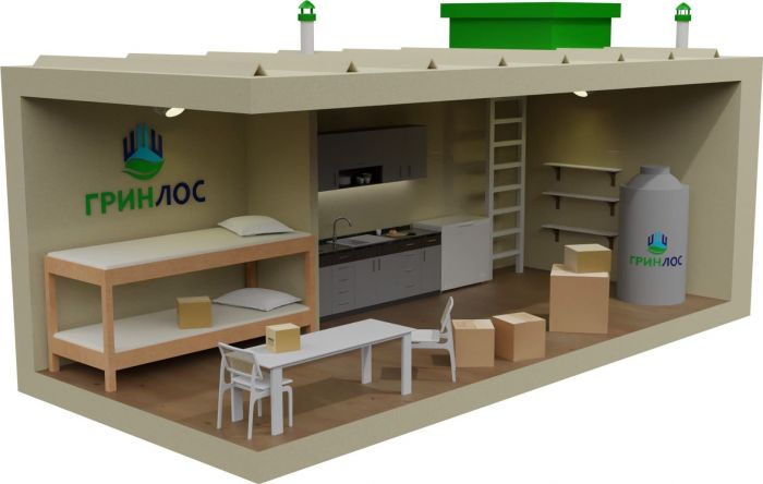 ГРИНЛОС Бункер 5000*2300*2000 — это герметично закрываемое помещение полной заводской готовности, перед эксплуатацией заглубляемое под землю. Внешние размеры данной модели составляют 5* 2.3* 2400 мм с учетом входа. Бункер оборудован освещением, системой приточной и вытяжной вентиляции, полками и емкостями для хранения, а также бытовым оборудованием.