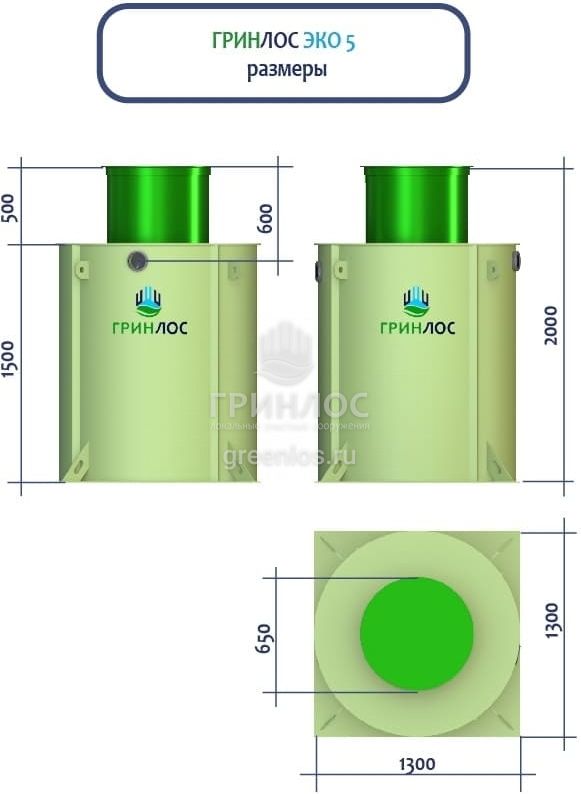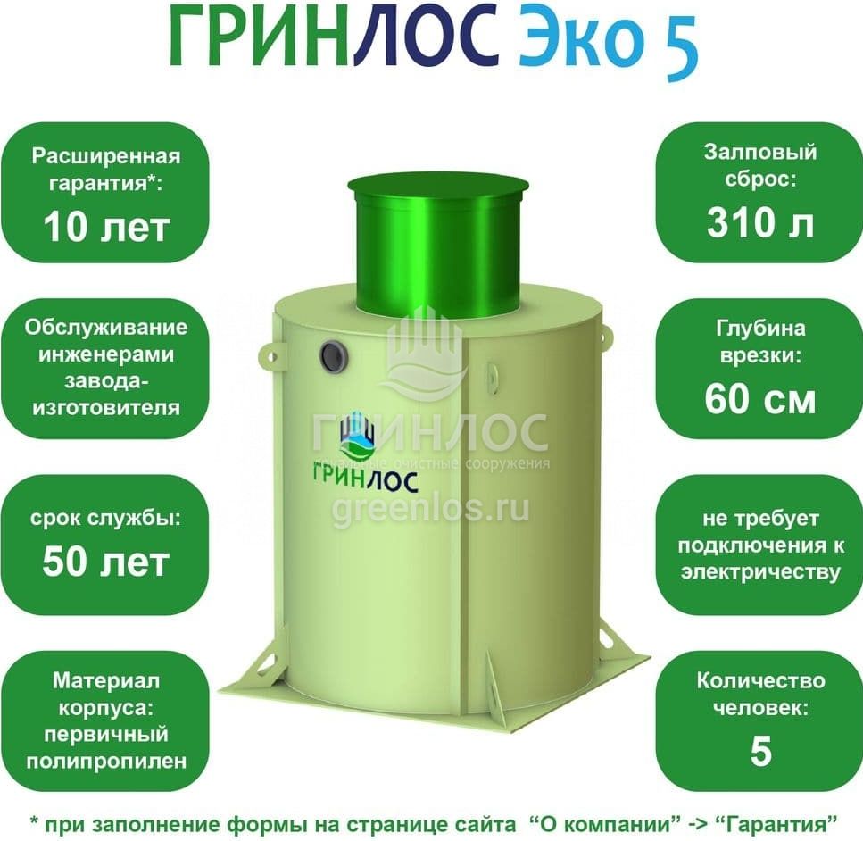 ГРИНЛОС Эко 5 — это энергонезависимый септик с залповым сбросом 280 л и производительностью 1  м3/сутки, что делает его подходящим для домов, в которых число жильцов не превышает 5 условных пользователей.