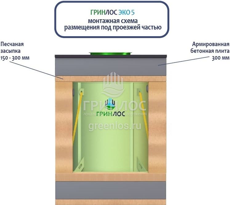 Септик глубокой биохимической переработки хозяйственно-бытовых сточных вод ГРИНЛОС Эко 5 следует располагать так, чтобы к ней мог беспрепятственно подъехать ассенизационный автомобиль. При этом над отстойником и над Септиком ГРИНЛОС Эко в радиусе 2,5 м не допускается движение и стоянка автотранспорта. При необходимости организации стоянки или проезда автотранспорта, необходимо оборудовать разгрузочную плиту над очистным сооружением и над подводящей и отводящей трассами.