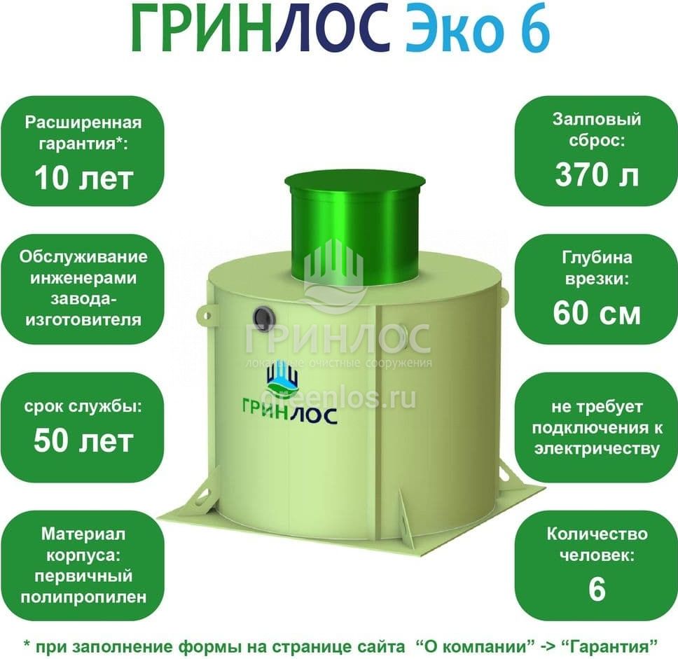 ГРИНЛОС Эко 6 — это энергонезависимый септик с залповым сбросом 360 л и производительностью 1.2 м3/сутки, что делает его подходящим для домов, в которых число жильцов не превышает 6 условных пользователей.
