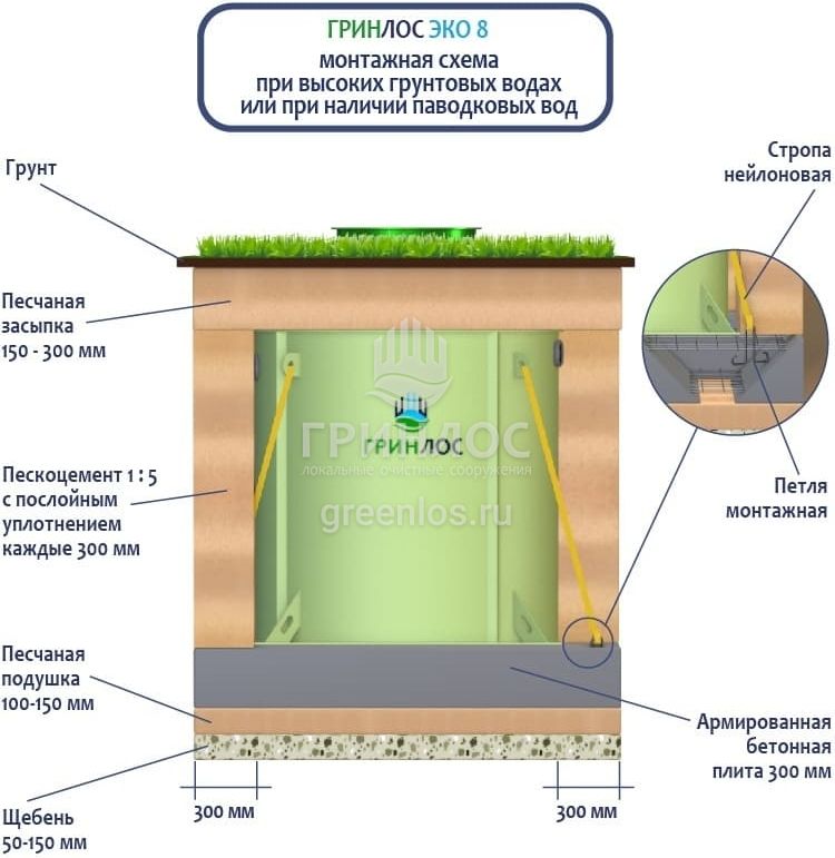 Благодаря равномерному распределению давления грунта на цилиндрический корпус, ГРИНЛОС Эко не деформируется даже без опалубки и подходит для установки в сложных грунтах.