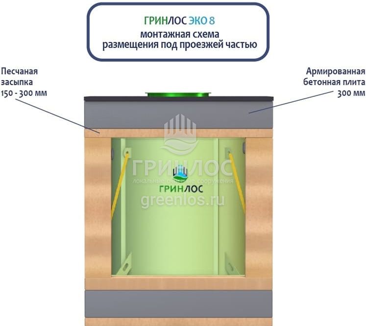 Септик глубокой биохимической переработки хозяйственно-бытовых сточных вод ГРИНЛОС Эко 8 следует располагать так, чтобы к ней мог беспрепятственно подъехать ассенизационный автомобиль. При этом над отстойником и над Септиком ГРИНЛОС Эко в радиусе 2,5 м не допускается движение и стоянка автотранспорта. При необходимости организации стоянки или проезда автотранспорта, необходимо оборудовать разгрузочную плиту над очистным сооружением и над подводящей и отводящей трассами.