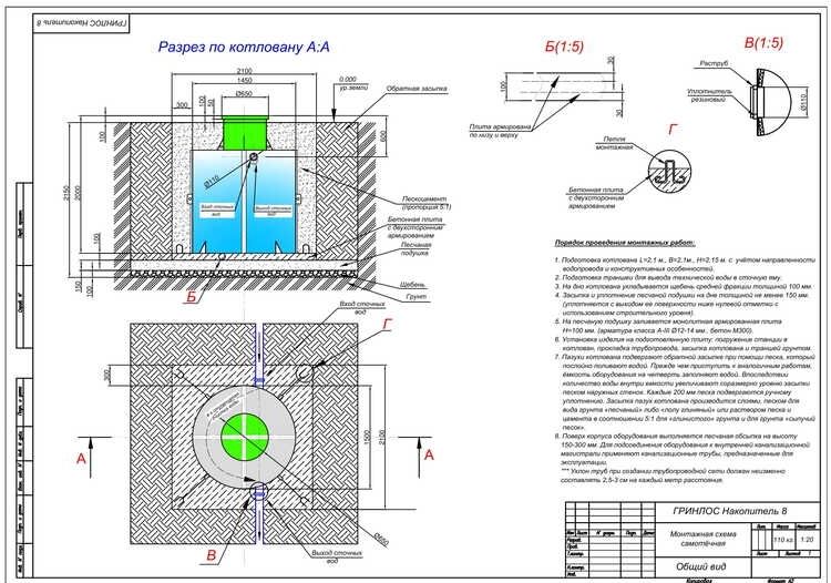 Целесообразно доверить выбор и монтаж оборудования специализированной компании. Перед непосредственным монтажом Оборудования специалисты осуществляют подготовку котлована. Его размеры определяются конструктивными особенностями выбранной модели оборудования. Ознакомиться с данными параметрами можно в приложении к ПС. По боковым стенкам корпуса должно быть сохранено свободное расстояние до грунта не менее 250 мм. Дно котлована нуждается в более тщательной подготовке. Его подвергают выравниванию с последующей засыпкой слоем песка, обладающим толщиной в пределах 10-15 см. Пазухи котлована подвергают обратной засыпке при помощи песка, который послойно поливают водой. Прежде чем приступить к аналогичным работам, емкость оборудования на четверть заполняют водой. Впоследствии количество воды внутри емкости увеличивают соразмерно уровню засыпки песком наружных стенок. Каждые 200 мм песка подвергаются ручному уплотнению.