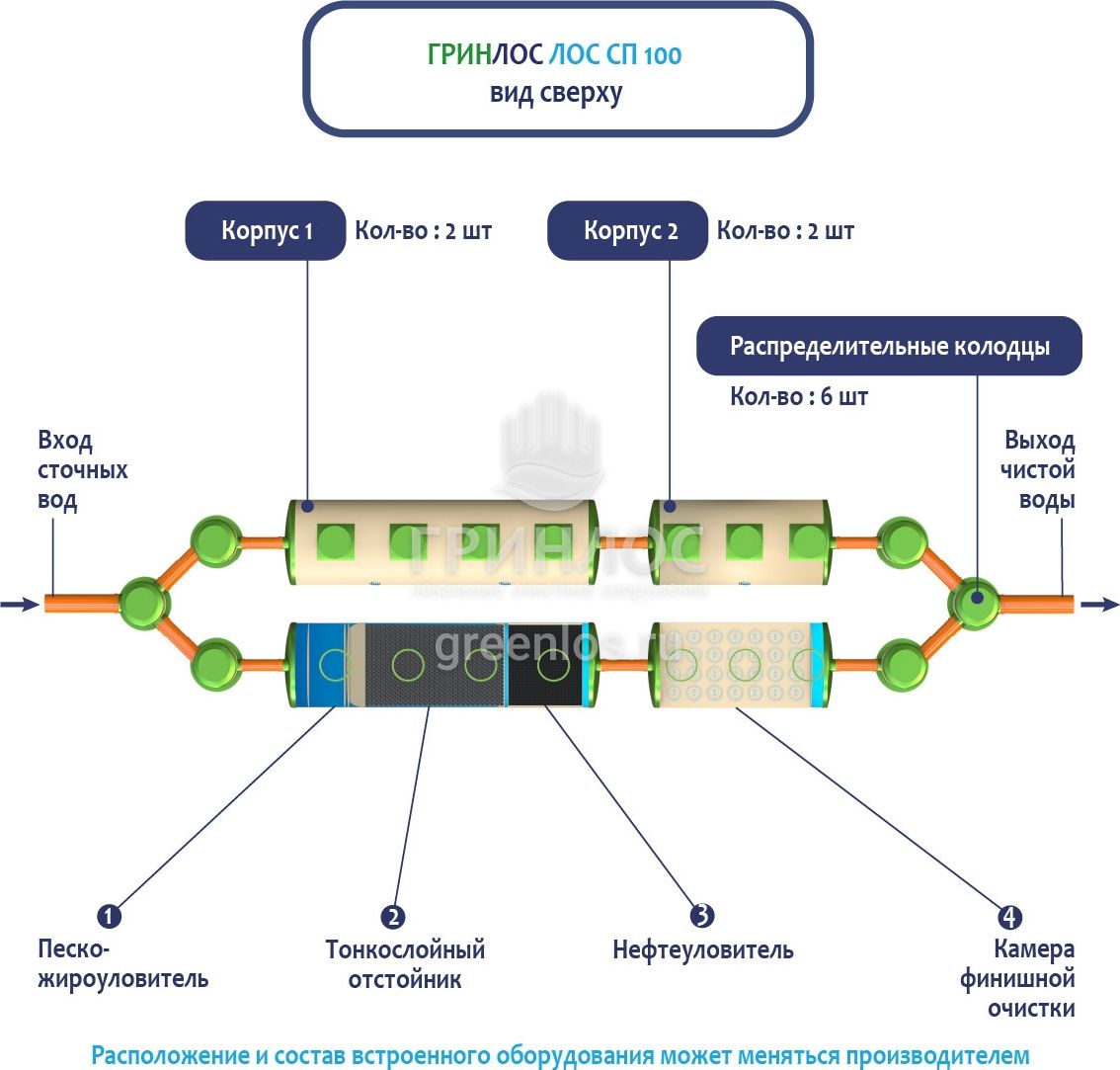 В Ливневой канализации ГРИНЛОС на 100м3 применяется классический принцип очистки дождевых и талых вод, заключающийся в поэтапном прохождении стоков через четыре отсека: