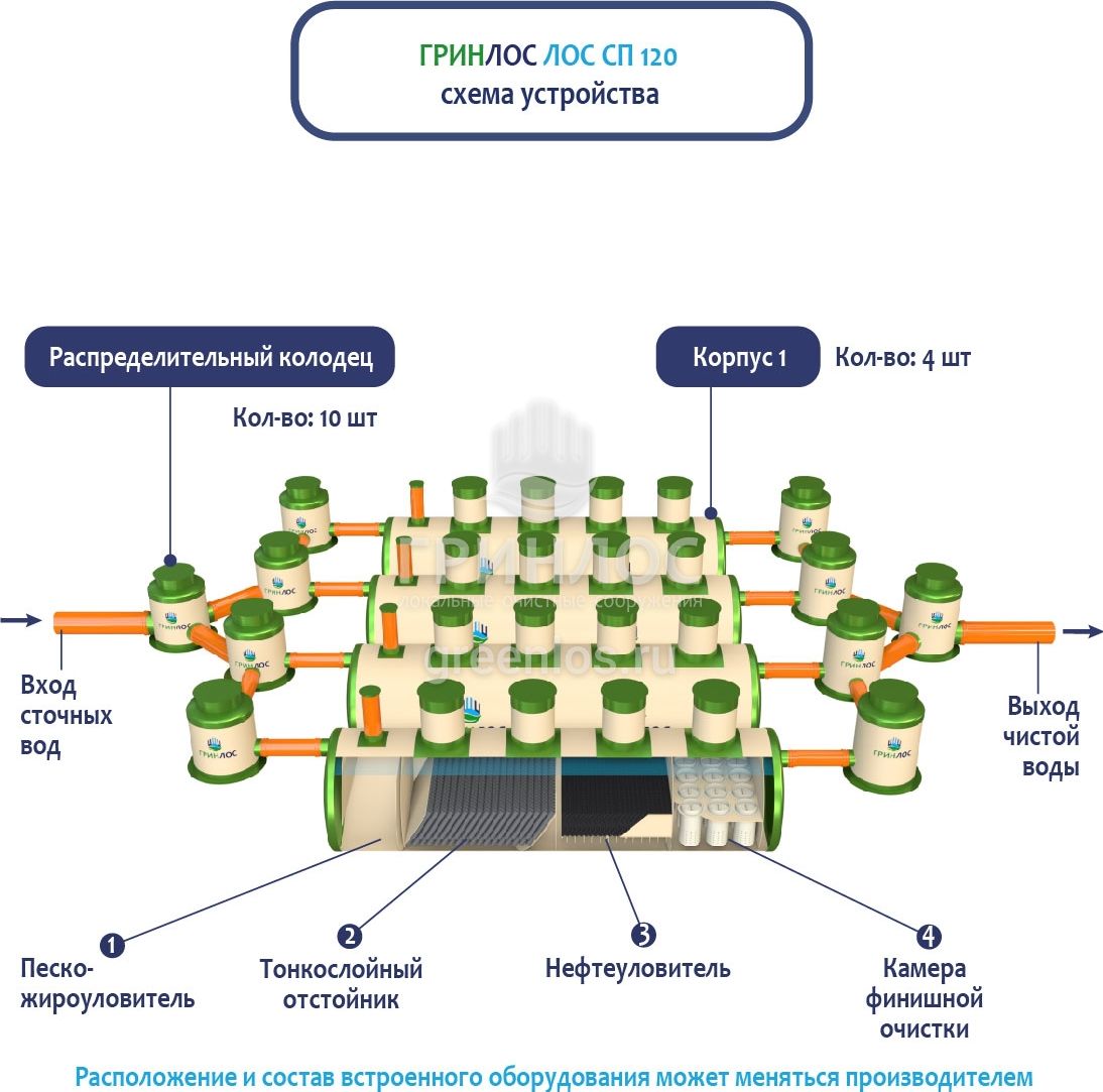 В Ливневой канализации ГРИНЛОС на 120м3 применяется классический принцип очистки дождевых и талых вод, заключающийся в поэтапном прохождении стоков через четыре отсека: