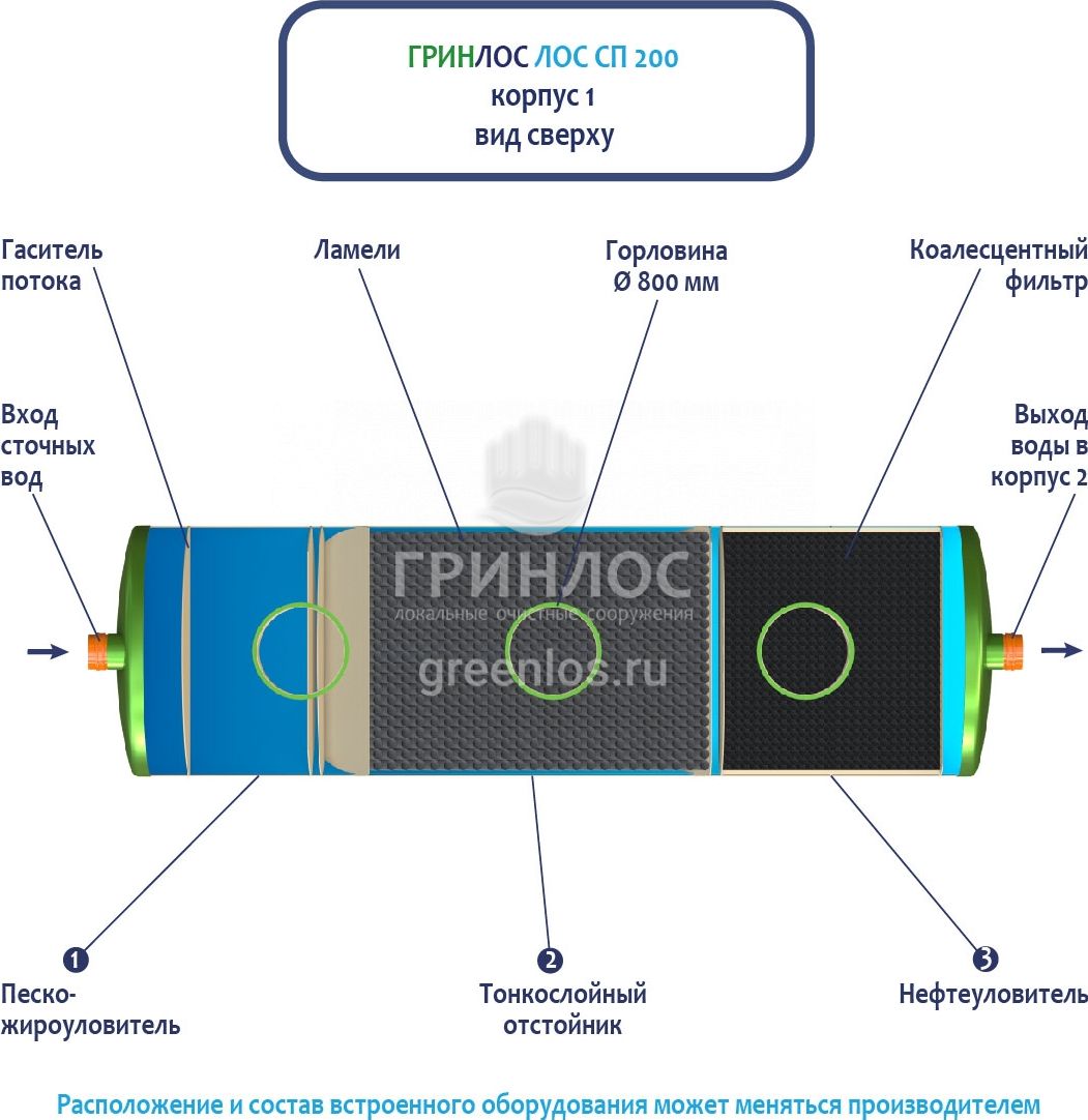 Стоки через входной патрубок корпуса Гринлос ГРИНЛОС Ливневая канализация 200-2300 стеклопластиковая попадают в песко-жироуловитель, где под воздействием седиментации из стоков выделяются взвеси и маслянистые вещества, за счет разницы плотностей твердые частицы оседают на дно, жиры собираются на поверхности.