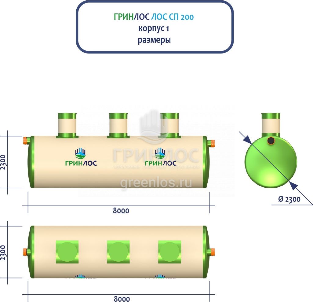 ГРИНЛОС Ливневая канализация 200-2300 стеклопластиковая представляет собой модульное очистное сооружение, состоящее из 8 корпусов размерами 8000*2300*2300 мм - 4 корпуса, 5500*2300*2300 мм - 4 корпуса. Объем отдельного корпуса 1 вида составляет 33.23 м3, 2 вида – 22.85 м3. Ввиду большого веса, для установки станции потребуется применение вспомогательного оборудования.
