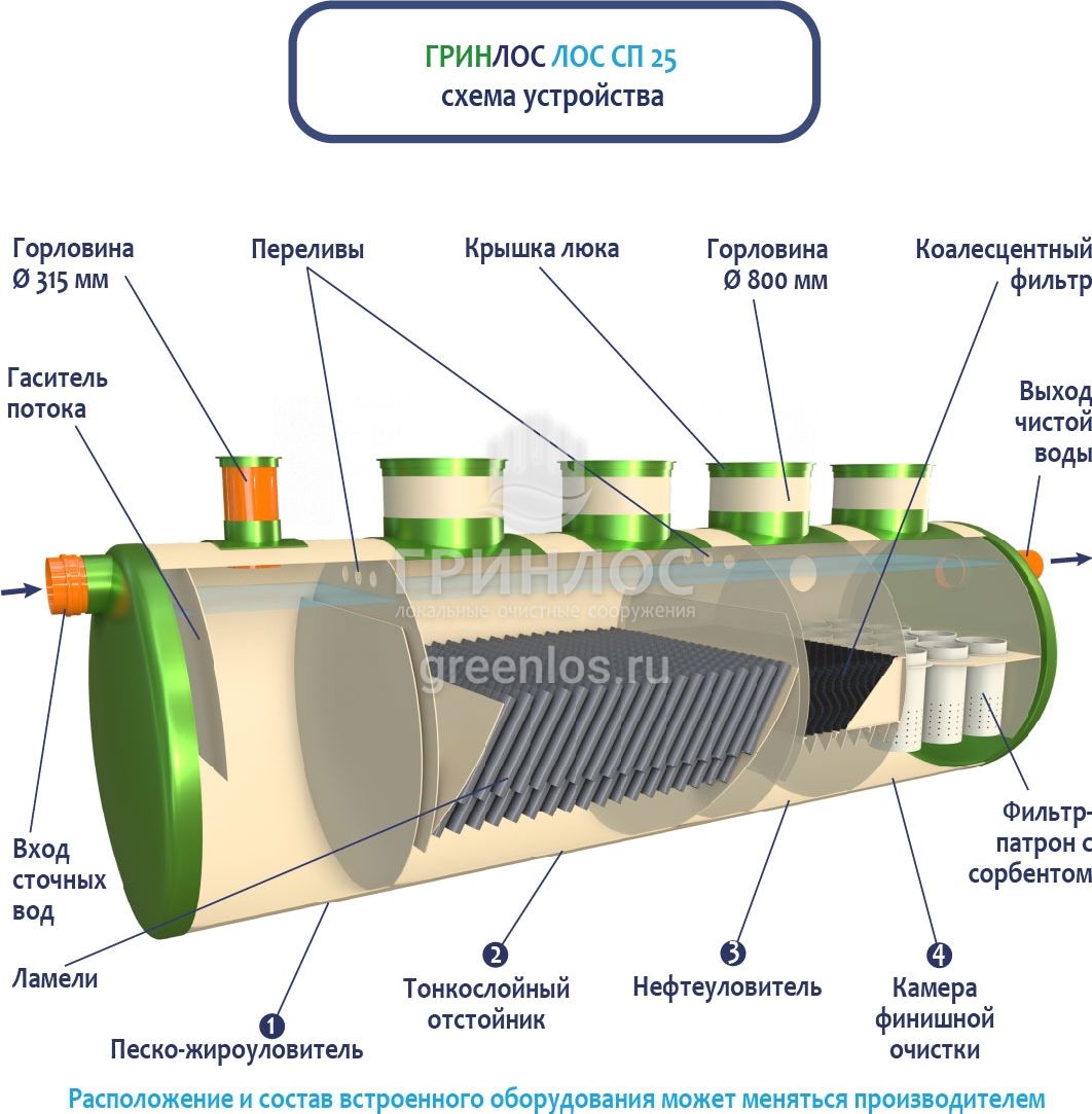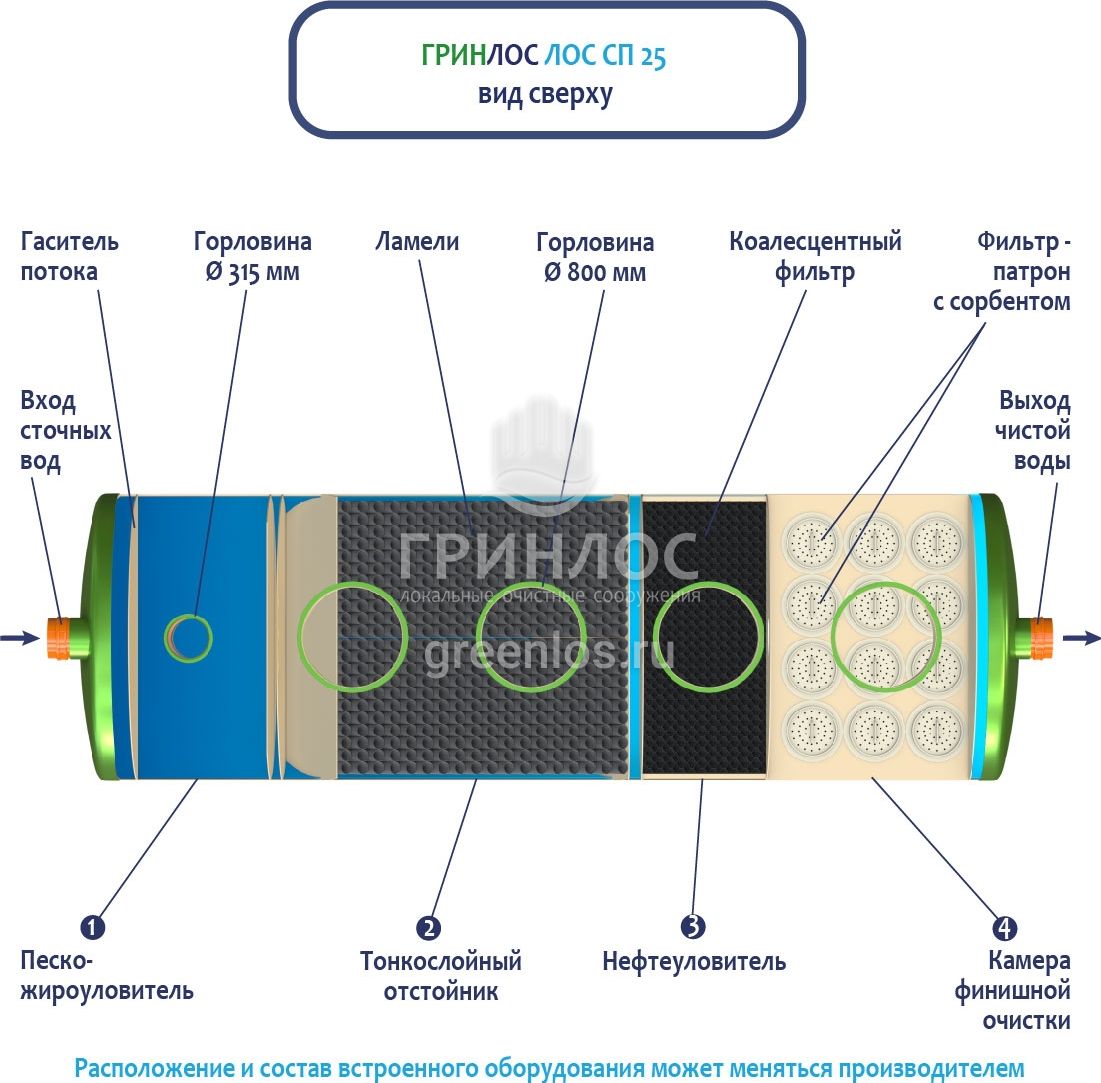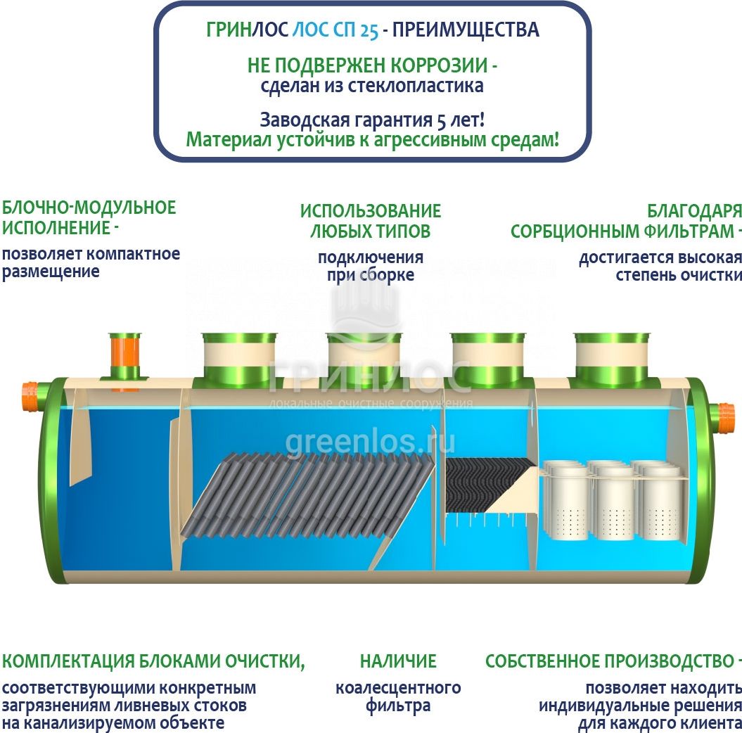 В базовую комплектацию Ливневой канализации Гринлос входит нефтеловушка, которая работает по принципу отстаивания стоков