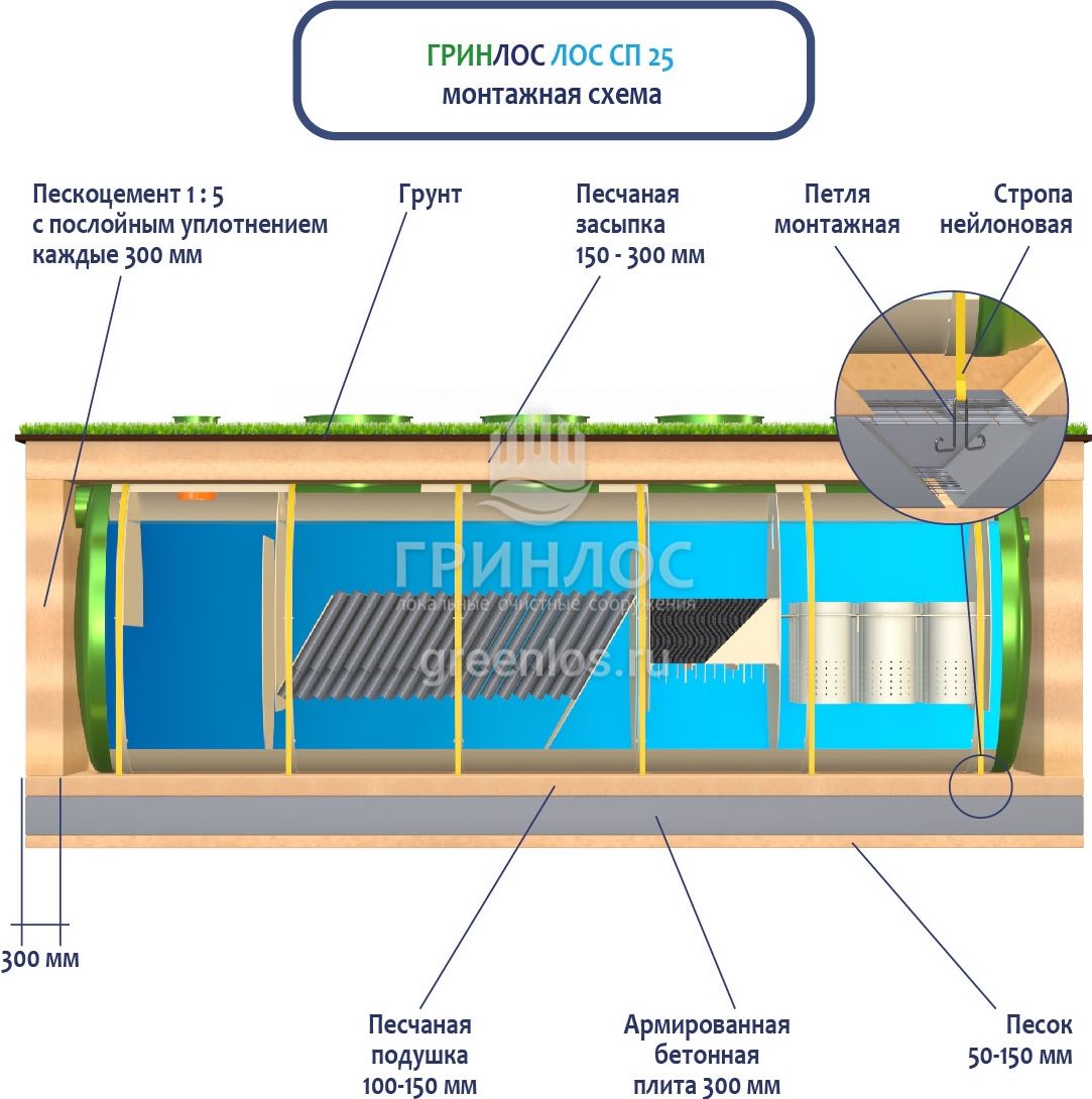 Перед началом работ выполняется входной контроль качества, осмотр оборудования с целью обнаружения дефектов, полученных при транспортировке и хранении, с последующим подписанием акта передачи оборудования в монтаж. Установка стеклопластиковой ливневой канализации ГРИНЛОС Ливневая канализация 25-2300 стеклопластиковая производится монтажным краном, с помощью четырехветвевой стропы. Изделие монтируется строго по уровню. После установки он фиксируется на плите синтетическими стропами за заранее подготовленные монтажные петли в плите.