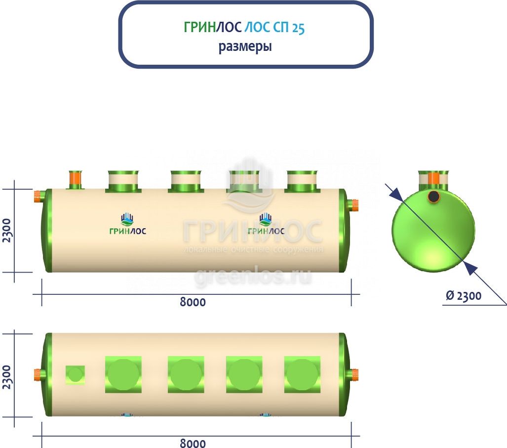 ГРИНЛОС Ливневая канализация 25-2300 стеклопластиковая представляет собой очистное сооружение ливневых стоков габаритами 8000*2300*2300 мм - 1 корпус. Общий объем корпусов составляет 33.2 м3. Для установки станции потребуется применение вспомогательного оборудования.