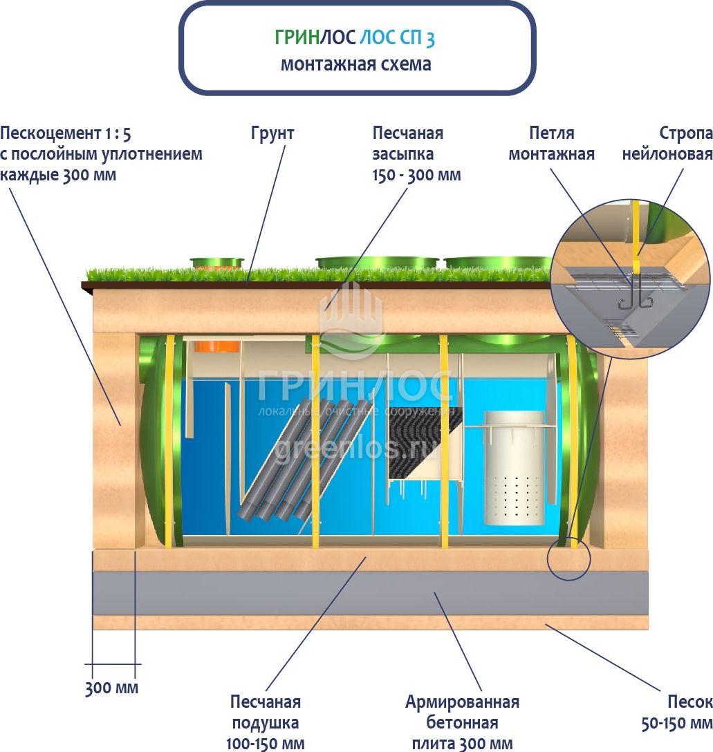 При заглублении ЛОС из стеклопластика на глубину не более 250 мм от верхнего пластикового горизонтального перекрытия до запланированного уровня земли, в однородных грунтах с низким уровнем вод обратную обсыпку допустимо производить песком, смешанным с цементом (марка не ниже М500). Соотношение цемента и песка для обсыпки составляет 1:5. Песчано-цементная засыпка производится послойно, с обязательным трамбованием и проливкой водой каждого слоя. Толщина каждого слоя 300 мм. При условии уровня грунтовых вод выше 1500 мм от уровня земли, при наличии плывуна, скальных грунтов и прочих нестандартных ситуациях, а также в случае заглубления ЛК 3-1500 Сп более чем на 250 мм песчано-цементную смесь необходимо заменить бетоном. Одновременно с засыпкой ливневой канализации, она заполняется водой. Уровень воды должен превышать уровень засыпки (бетонирования) не менее, чем на 200 мм и не более, чем на 500 мм.
