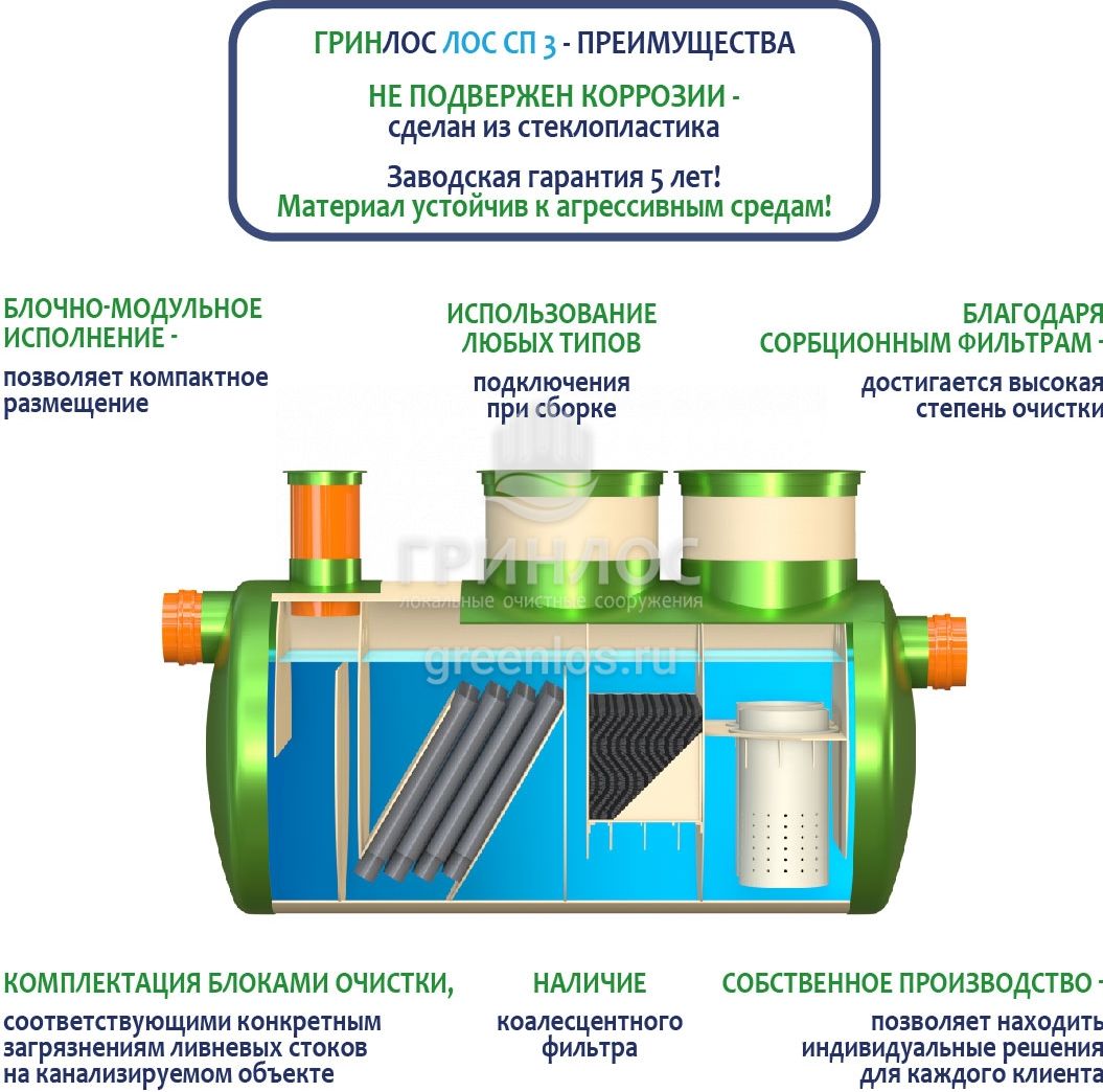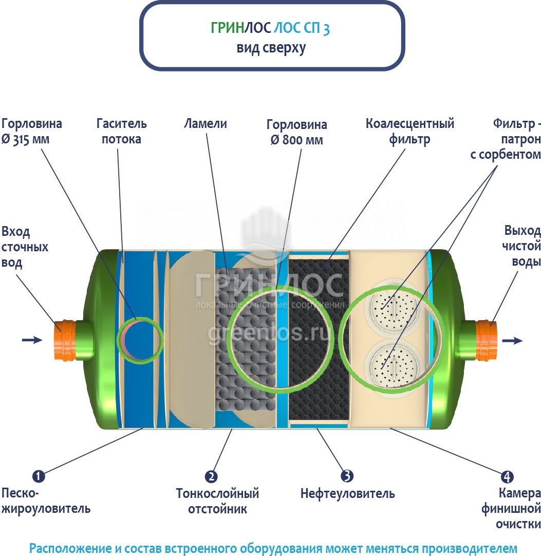 В базовую комплектацию Ливневой канализации Гринлос входит нефтеловушка, которая работает по принципу отстаивания стоков