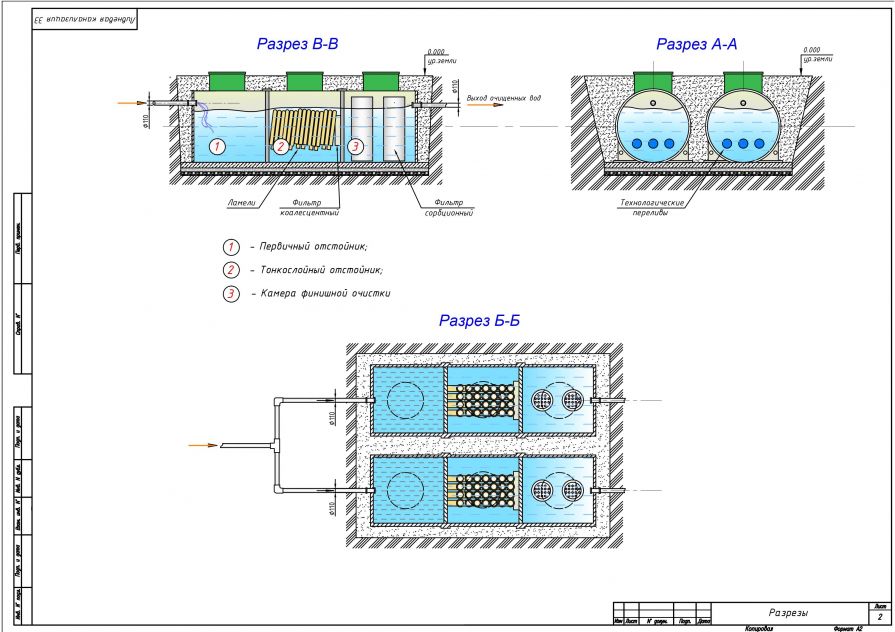Конструктивно данное сооружение для переработки поверхностных вод представляет собой горизонтальную цилиндрическую ёмкость, разделенную внутри перегородками на отдельные блоки. Остальные блоки являются вертикальными или горизонтальными емкостными сооружениями, имеющими в своем составе перегородки, насосное оборудование, трубопроводы с запорной арматурой и лестницами для обслуживания.
